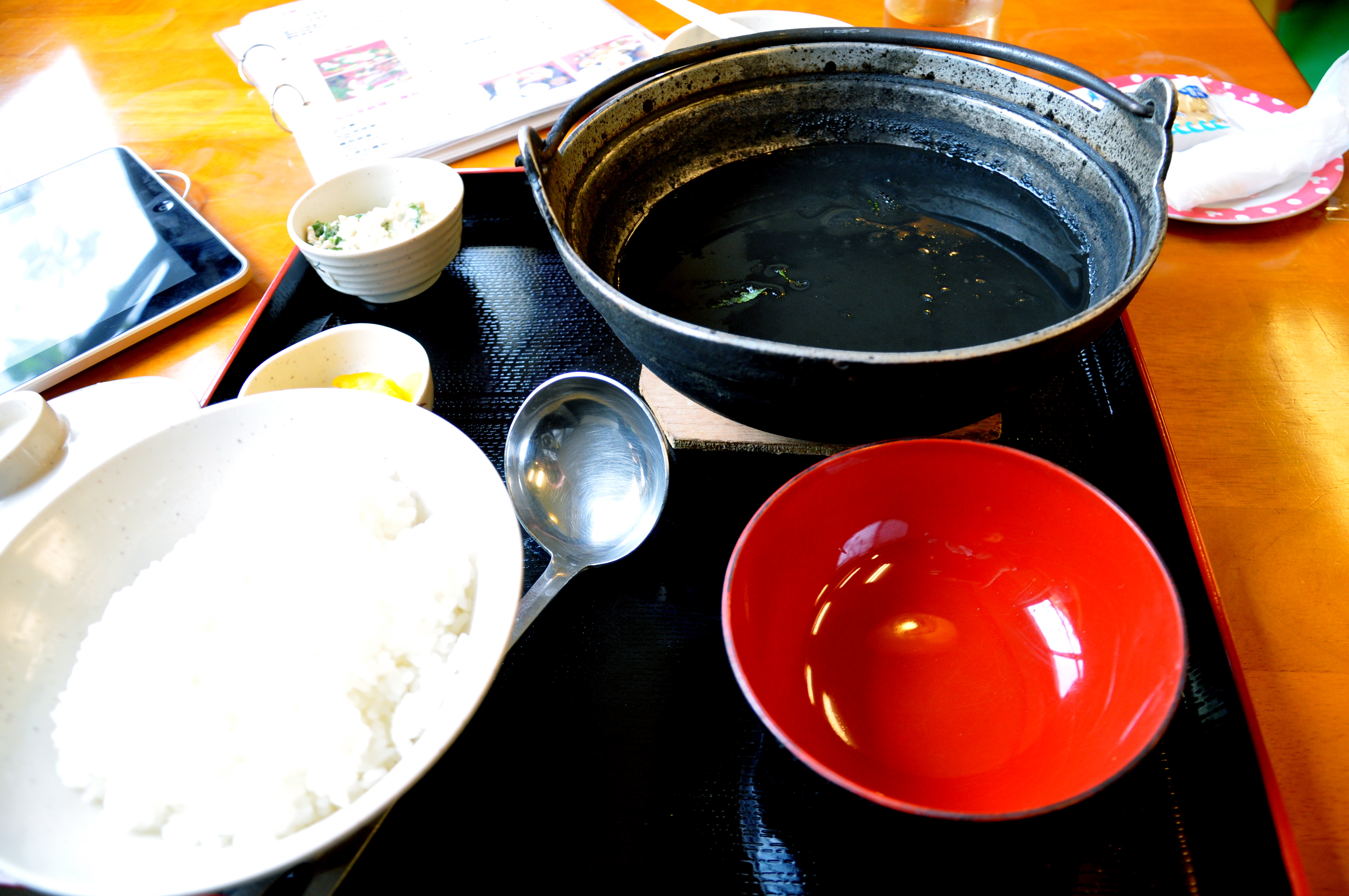 The black liquid in the black bowl turns out to be squid soup. It is delicious: thick black fish stock with lumps of squid, onion and green vegetable of the cabbage family.