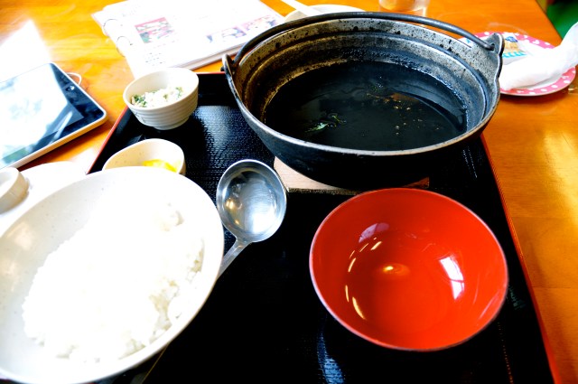 Luckily there are pictures on the menu, one of which is of a black bowl full of black liquid. I wait and wait and the servers seem to be ignoring me. I finally harumph a little and a lady immediately arrives. I have the impression that she is relieved that I have made up my mind at last and that she has been hanging around waiting, it being bad form to come to the table and ask what I want. However as with many things on Okinawa my interpretation could be very flawed.