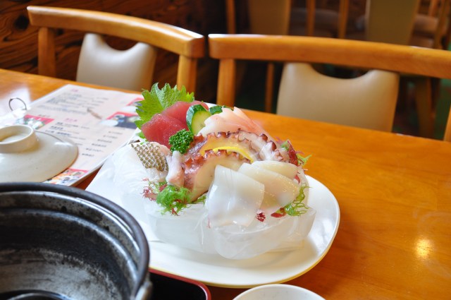 I also order Sashimi because I know what it is. It arrives looking regal on a bed of grated radish sitting on a lump of ice. Things start to go odd now. I am looking for the wasabi, which I fail to spot on the edge of the plate. There is a container thing on the table that I take to be the wasabi box. It has a white release button on top but even with repeated pressing the box does not open. I put it down just as the serving lady arrives and bows, looking inquisitive. I say very good, yum, yum and after a while she leaves. The sashimi is squid, octopus and 3 different fish. Big juicy fresh chunks of raw seafood.