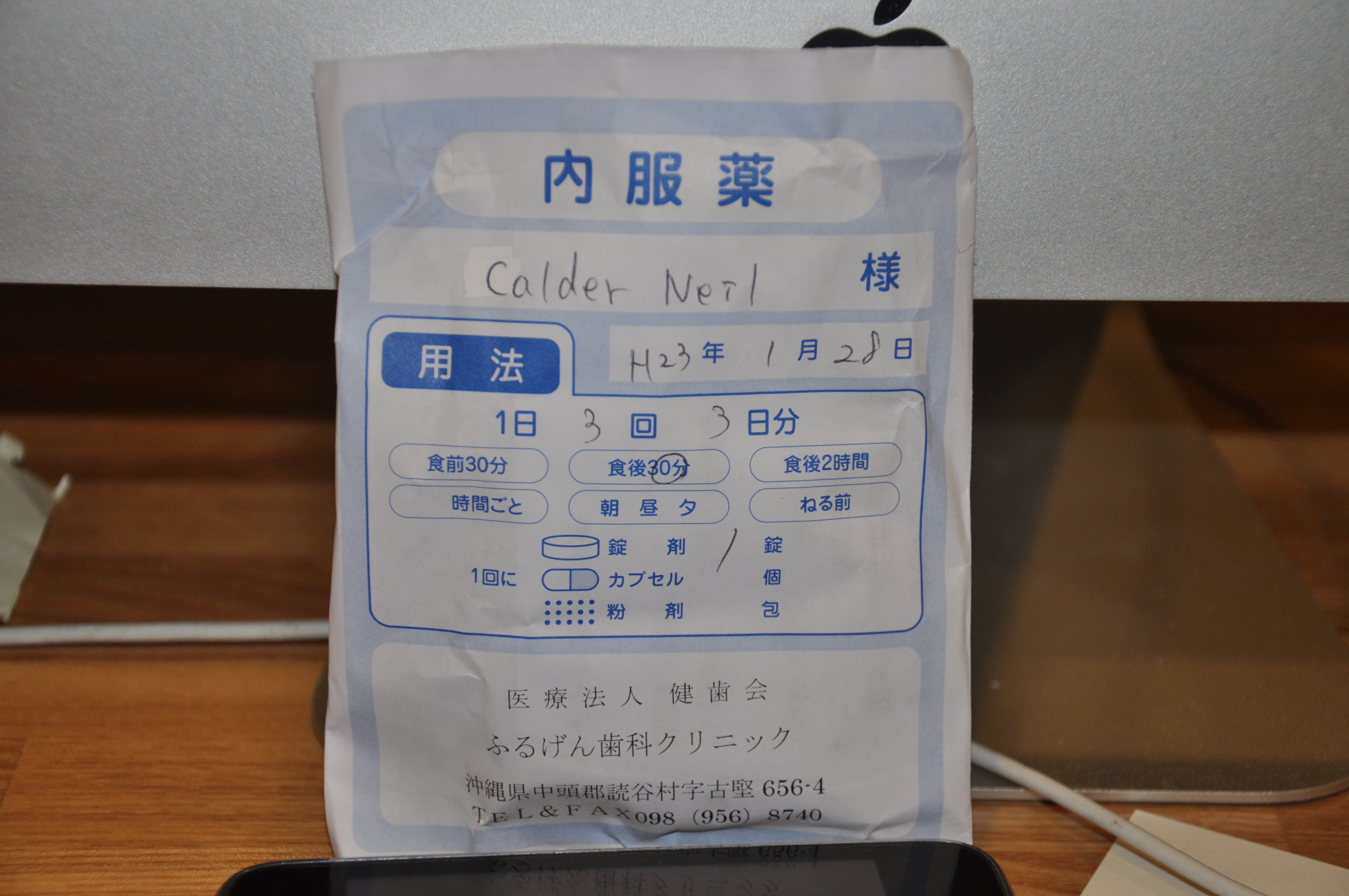 90 minutes later he is done and storms off to drill someone else. I am given some pills and told to come back on Wednesday. I give them 2,300 yen – ~$30. Thinking back to US days of first session with Dentist who would then send you to an Orthodontist. You get an appointment a week later, he then sends you to a pharmacy to pick up the drugs. Two weeks and a $1000. Japan gets straight to work.