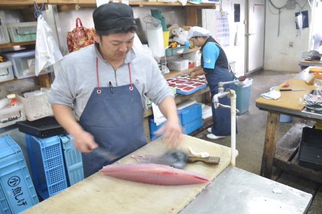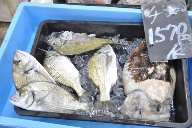 Frabjous day to discover the fishing port in Yomitan where I now live. They do not freeze. You stumble into the fish landing place and with the usual duh-sorry-i-am-a-nice-guy-but-unable-to-speak-sensibly-body-language. I buy a squid, fillets of some kind of fish and get the guy to slice some steaks from a big lump of fresh tuna.