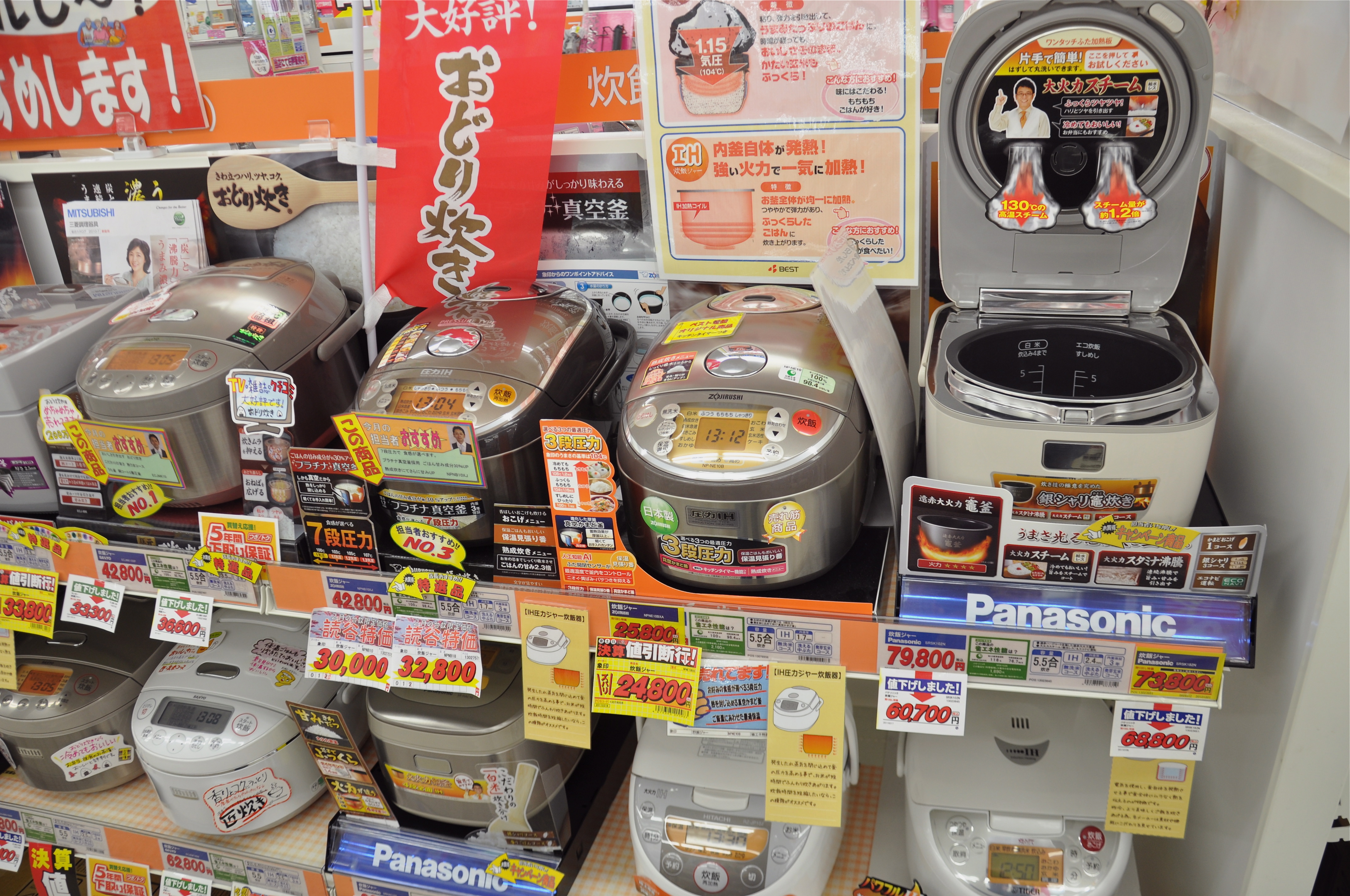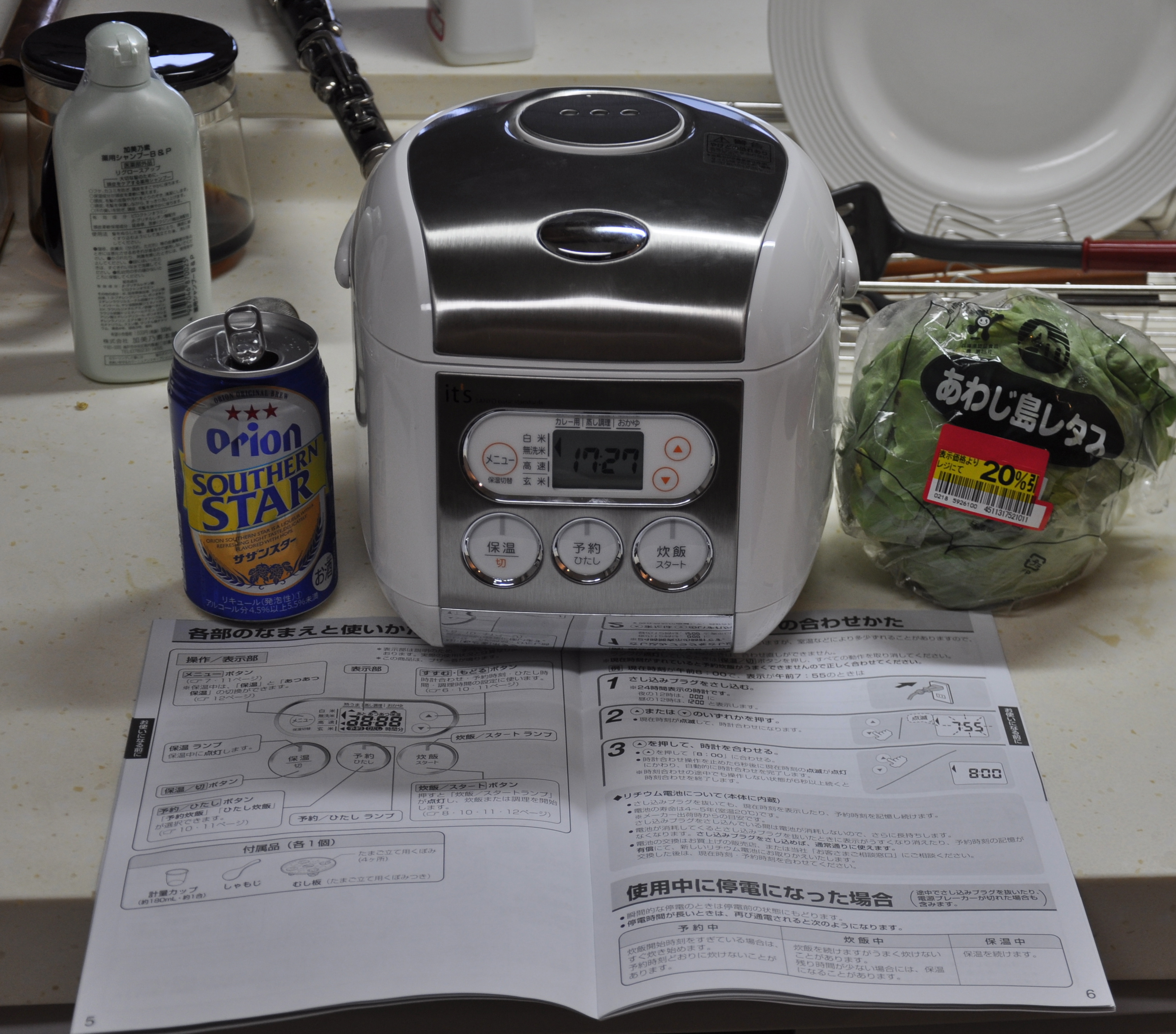 I choose my cooker. It appears to be on offer. Instead of 9,990 yen it is 5,990 yen. Cool, I go to check out and the very sweet checkout lady charges me 9,990. I say ” Er , I am a nice guy but I cannot speak Japanese but if you come with me you will see that this cooker is marked as 5,990 yen.” We go and look at the sticker and she says a lot but I do not understand. Another shop person arrives and says in English, “You want old?” and takes me to another part of the store where lo there is my cooker at 6,990 yen. I interpret all this as follows: original price 9,990 yen, some kind of store club price 5,990 yen but they have a display model that is on sale for 6,990 yen. But, hey, I could be very far from the mark.