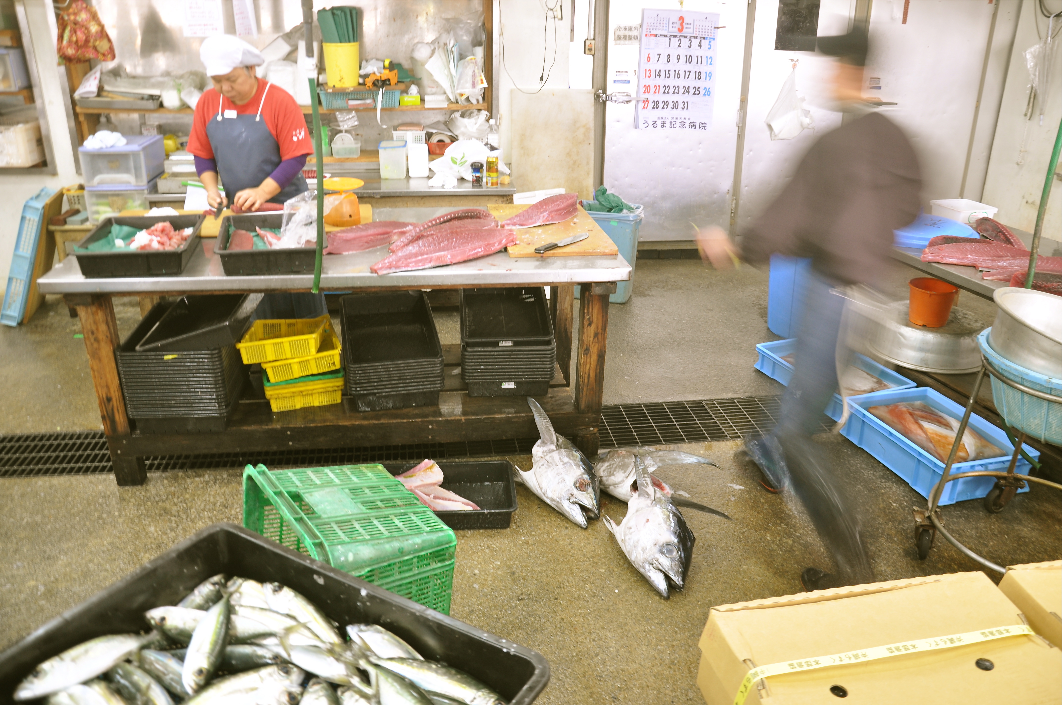 Big Red likes it in Okinawa. She takes me to the fish restaurant/ market with no bother at all. This place serves meals but also sells fish. I feel that its main business is preparing fish for other shops and restaurants as everyone is slicing and gutting and only lay down their steely knives to come and serve you.