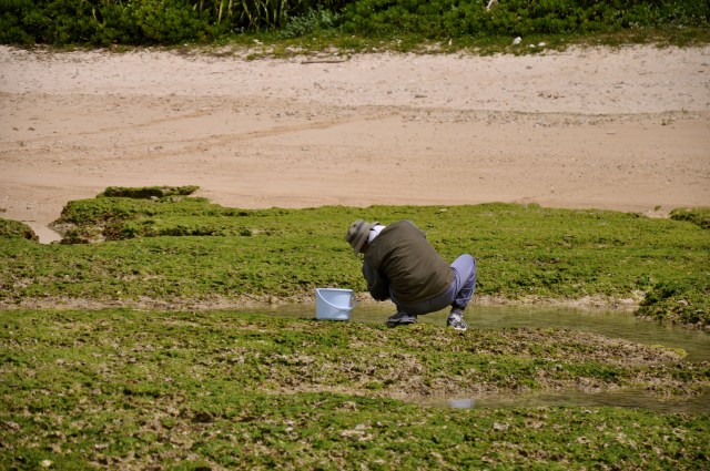 It is Saturday morning so I set off to the fish shop. I ride along the coast line occasionally stopping off at beaches to watch people collect seaweed in the rock pools.