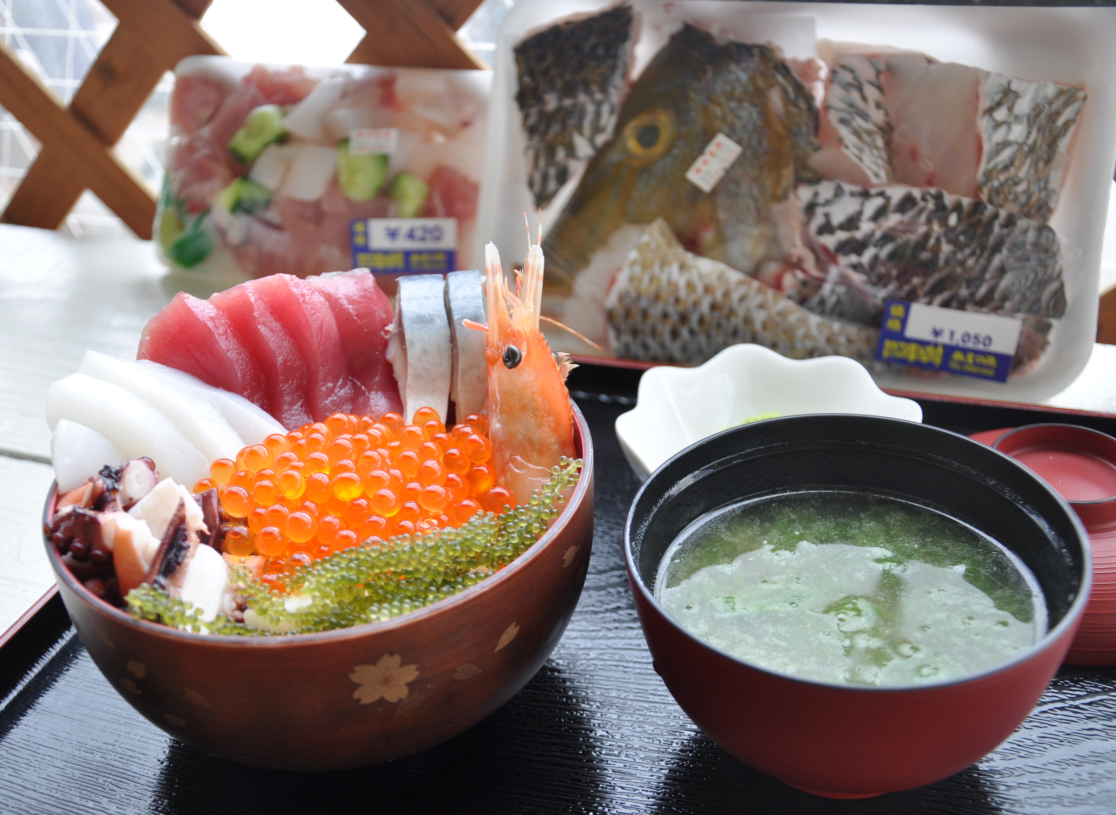 Sea grapes, fish eggs, octopus, squid, tuna, other fish, prawn, on plain rice. All raw, er except the rice, and all just pulled from the deep. There is a bowl of seaweed in fish broth to go with it. It costs 900 yen. Wonderful bike ride along country roads beside the South China Sea in warm sun, terminating in world beating fish lunch in the simplest of settings for very little money. I lke it here.