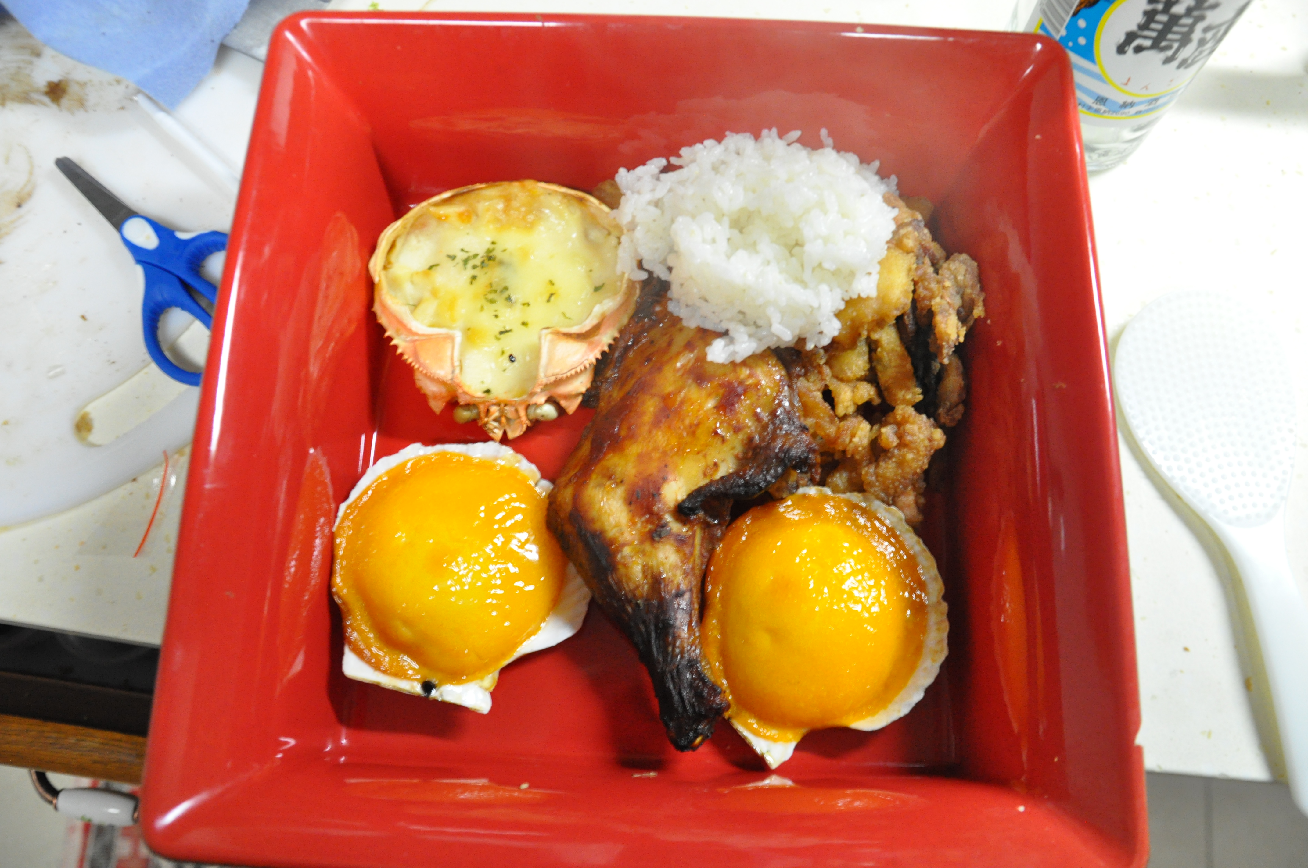 Tonight I get, two scallops in a cream sauce, deep fried squid, a crab and believe or not some meat in the form of a chicken leg. A couple of days ago I got a lobster. Tonight’s lot cost 700 yen. Worth staying at work for.