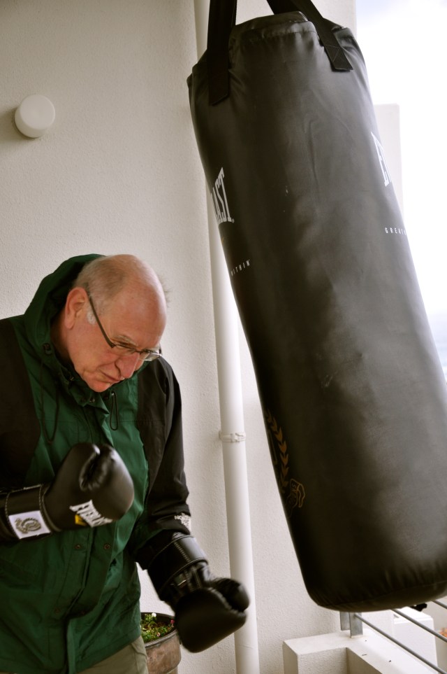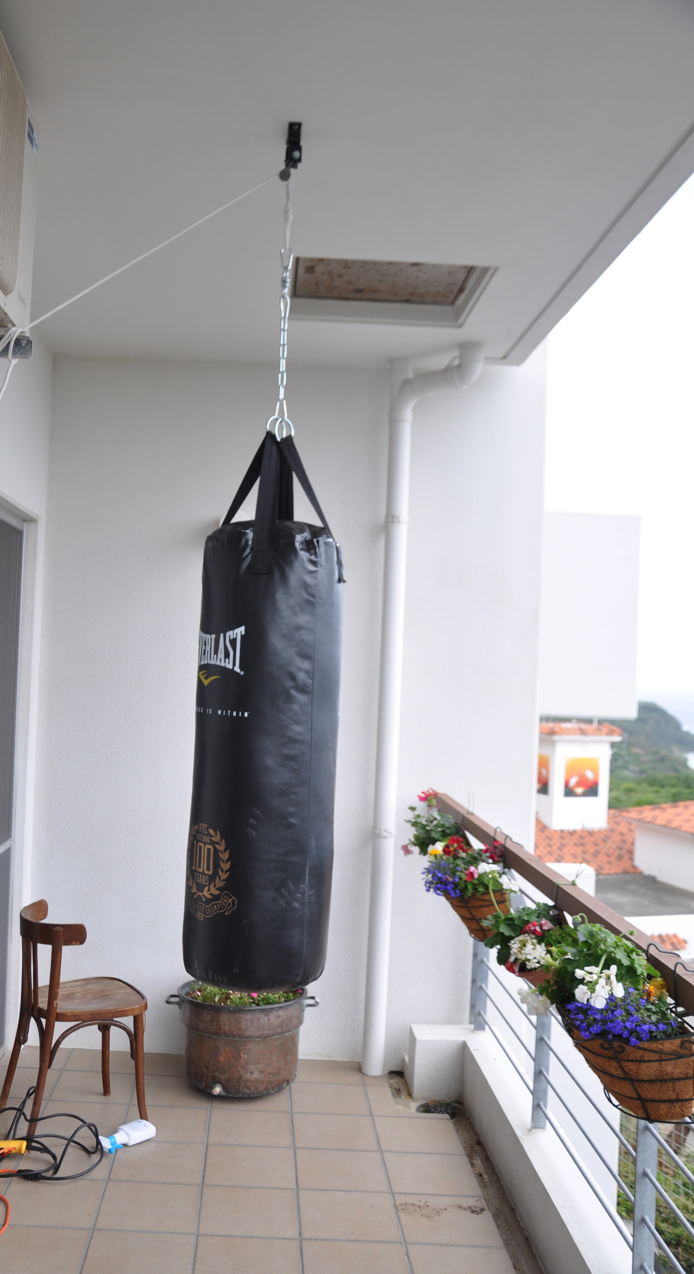 Ding, ding it is 7:00 am. I spring from the futon, pull on some shorts, a t-shirt and head out onto the terrace. Blue, blue China Sea, green, green Okinawa, fresh, fresh air and straight ahead the heavy bag.