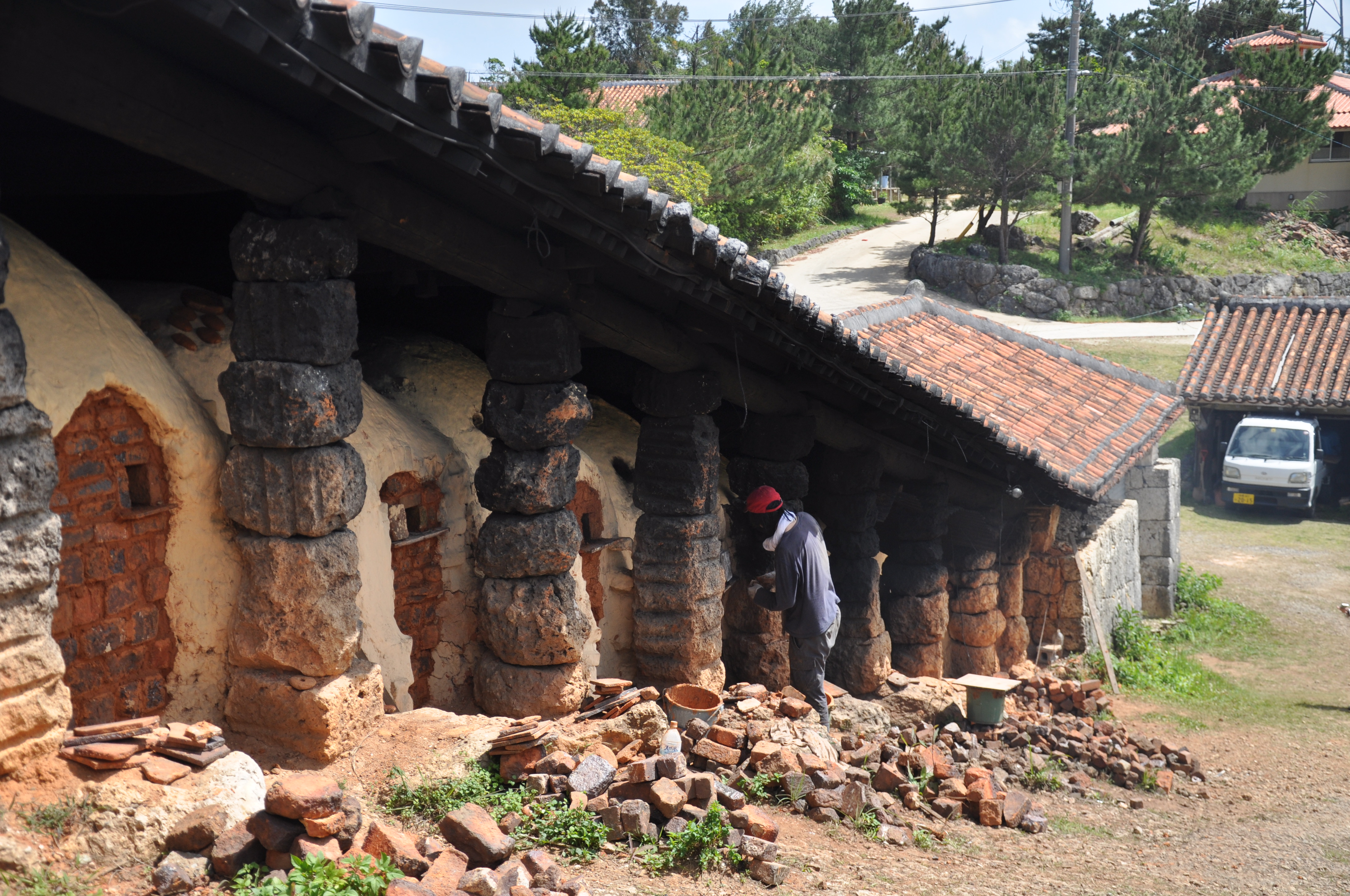 “Today, three main kilns dominate Yomitan. Probably the most well known of the three is the central Kita Kiln (Kita Gama). Designed by master potter Shinman Yamada (who has a studio nearby), the kiln is a nobori-gama (climbing kiln) used for firing jōyachi (glazed) pottery. Built on a slope, the kiln consists of nine chambers called fukuro. It is fired only a few times a year, with each artist receiving opportunities to place their items in the kiln to be baked.”