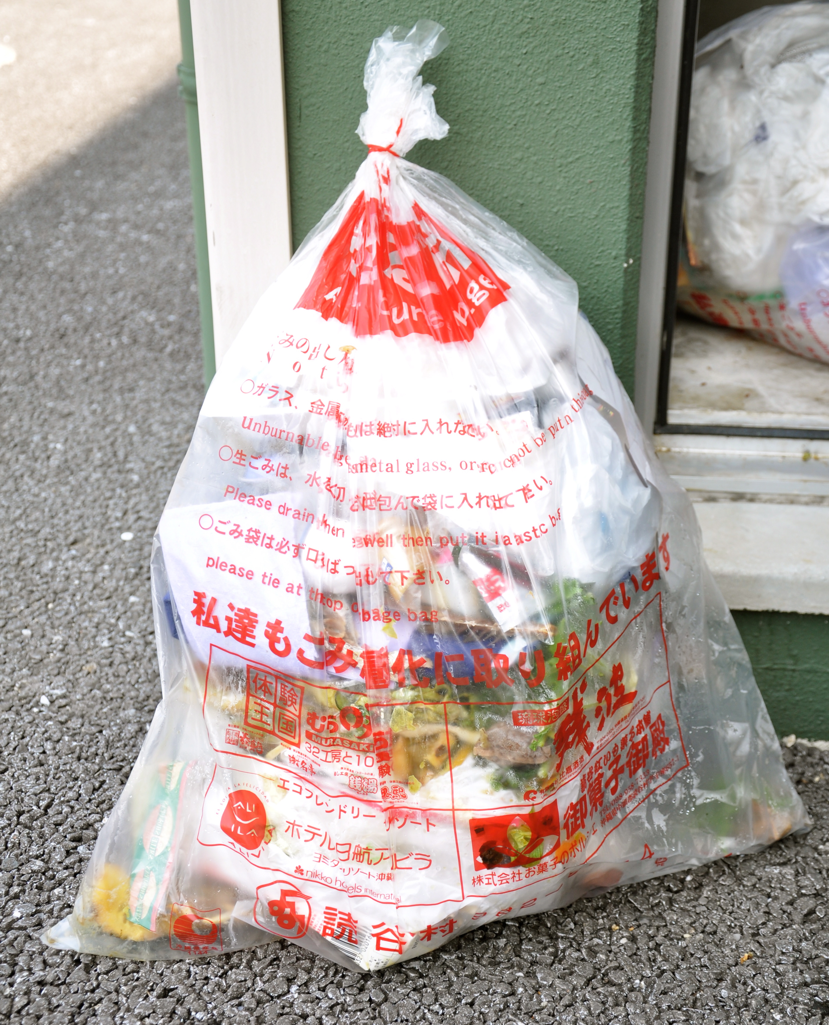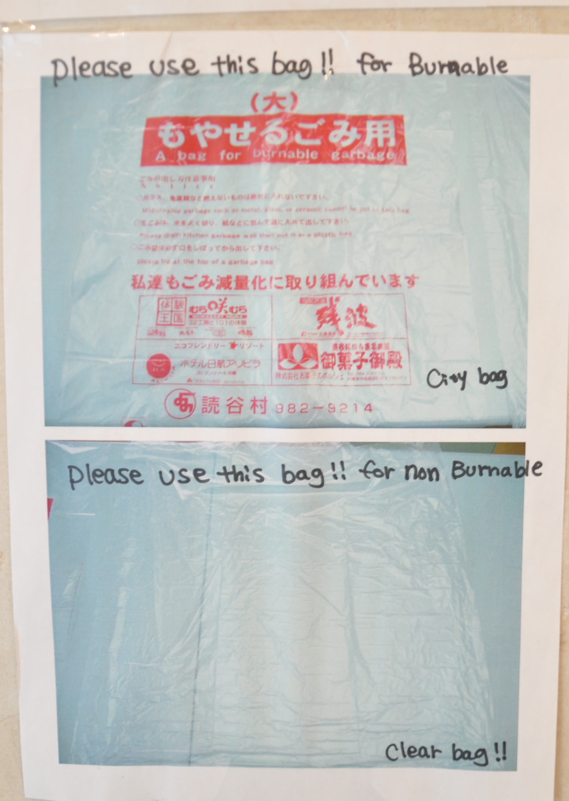 the other is non-burnable. Burnable goes into special bags that you can buy from local convenience stores. Each town has its own bags so don’t go using Onna-son bags in Yomitan. These bags have red writing all over them. Non-burnable goes into clear plastic bags and there is an exception for plastic bottles, which, O best beloved, will burn but must also be junked into clear plastic bags.