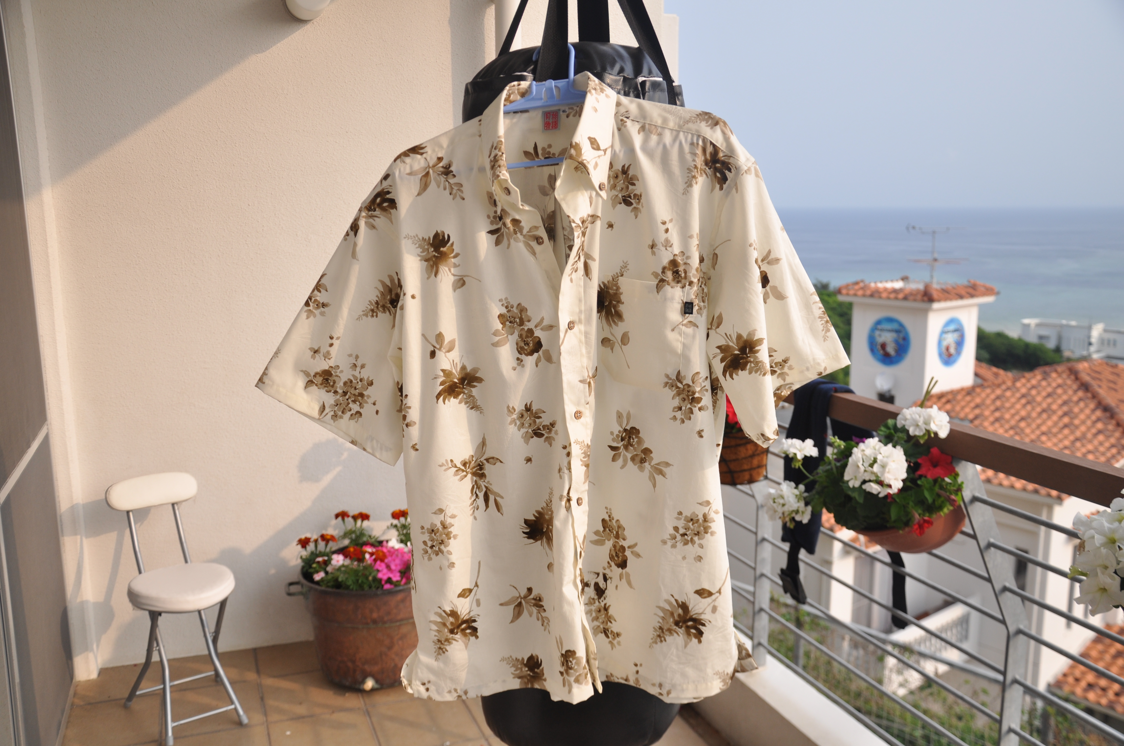 In Okinawa there correct formal dress in the Summer months is not the ubiquitous shirt and tie, I am told, but the Kariyushi shirt. These a highly patterned affairs with lots of flowers and things. I bought my first one to wear on a visit by the President of the University of the Ryukyus. It is beautifully woven from thread made from cotton and er leaves. This is how the lady I bought it from explained it.