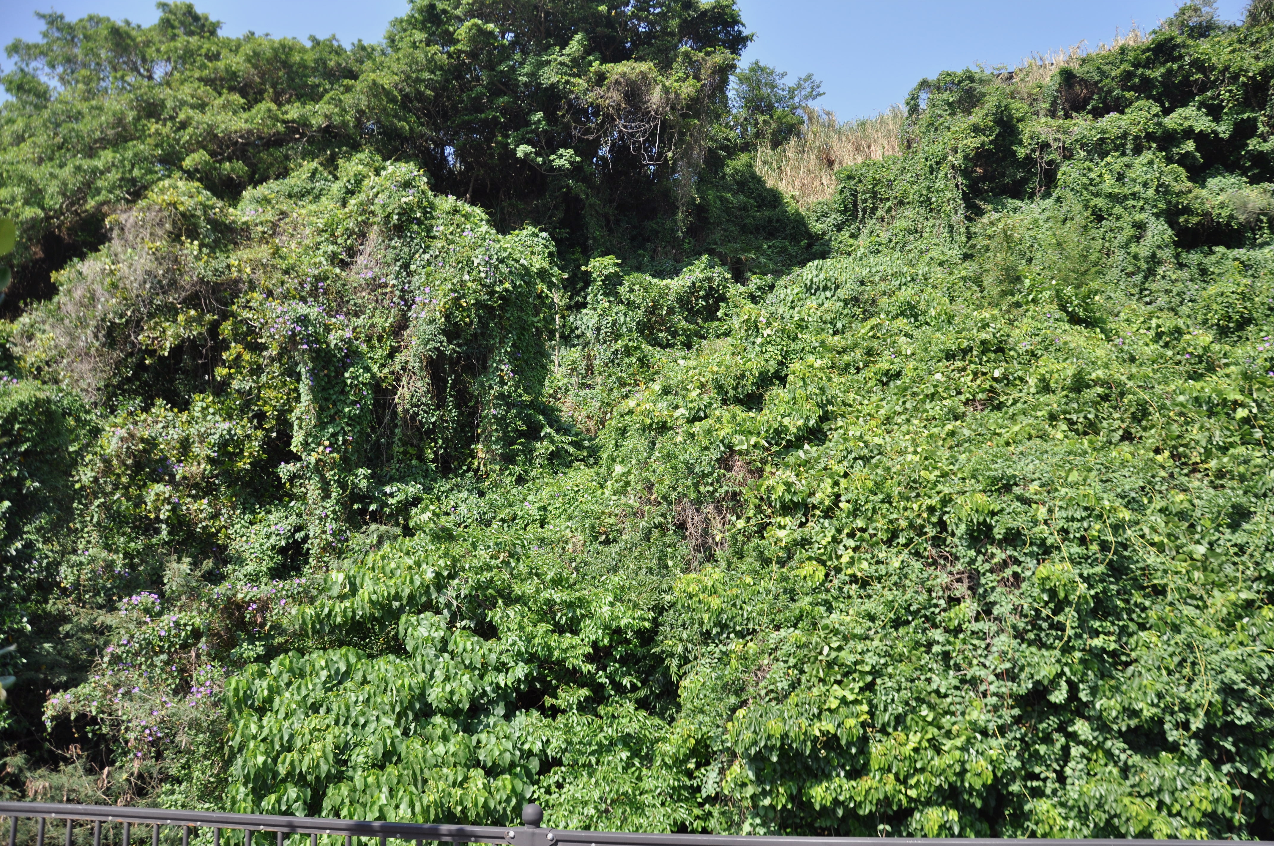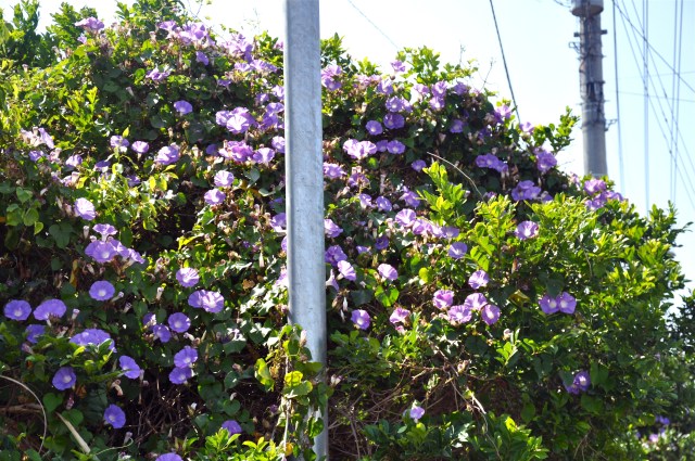 Okinawa is absolutely covered in Morning Glory. Lamp posts, houses, hillsides are bedecked with the plant. It climbs tens of meters up trees and the drive to work in the morning is a joy as all the flowers are out and pointillist splats of blue are everywhere.