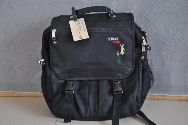 Here is another bag. It was given to me by my learned friend Barbara Warmbein which means warm leg. What a wonderful name. I don’t think there is an English version. Anyway Barbara was an intern in the Communication mill at CERN. It is a very deceptive bag. It is very attractive with an embroidered logo of a nerd reaching towards a sign floating in the ether which says “Science on Stage”. Do not trust this bag.