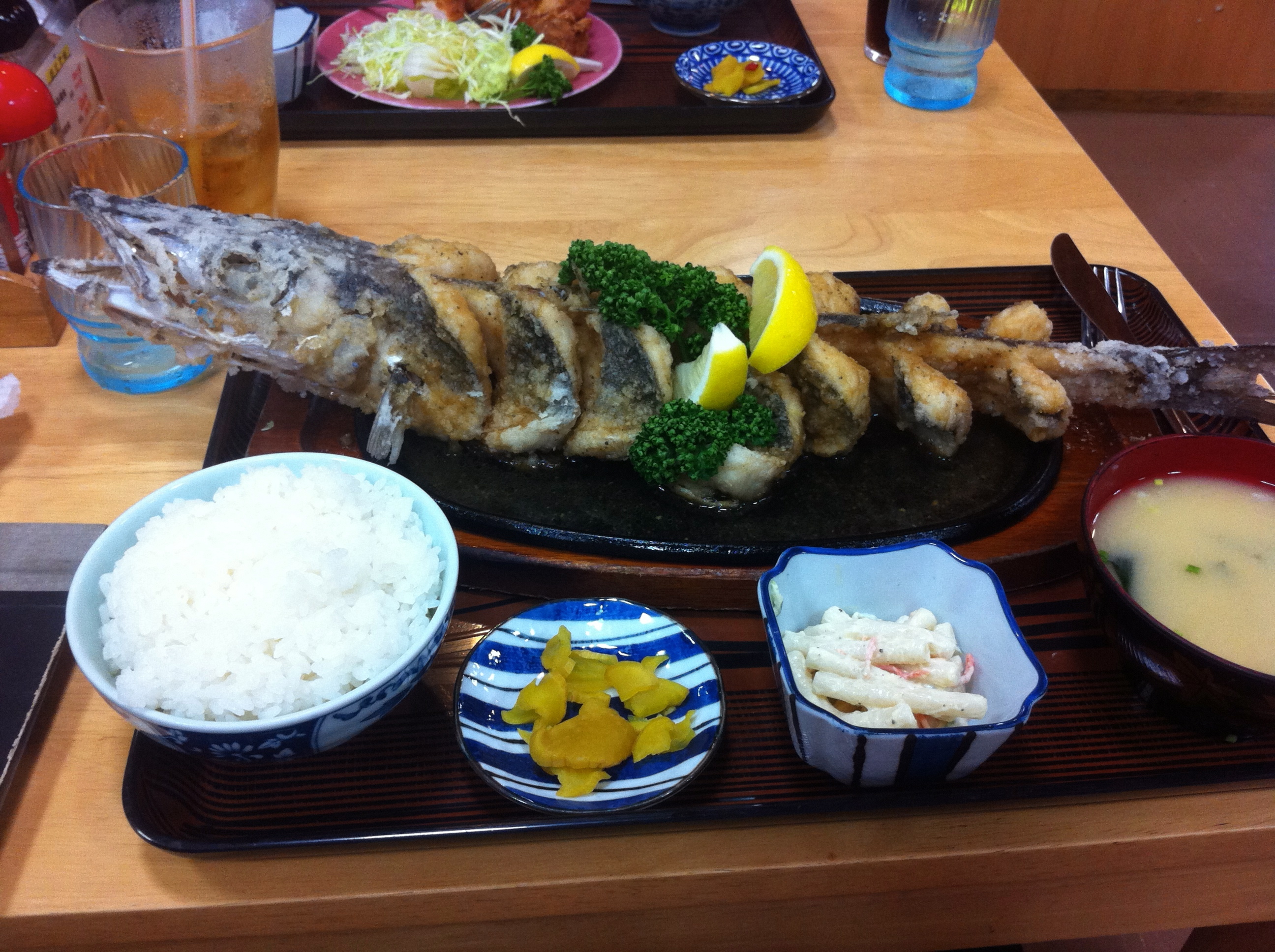 We go to a small local restaurant. I order “Butter scorched fish.” The lady comes out with a tray on which are two fish – one respectably sized the other an OTT barracuda thing. For me there is no choice but I believe that I will only get a section.