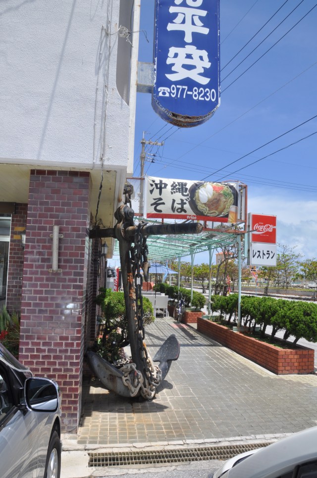 So I set off on an adventure. I am early for the boat so I set off on the bike to find a restaurant. I am on the East side of Okinawa, just across the road from a fishing port.There is a restaurant. Hmmm, good place to eat I grunt.