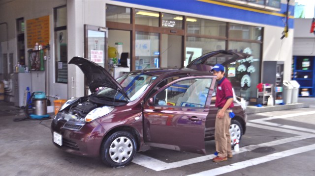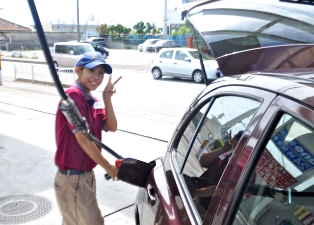On Okinawa nearly all the gas stations are Full Service, which is great because trying to work out how to use a self service pump with instructions in Kanji is a humbling experience. You drive into the forecourt and the uniformed attendants immediately cry welcomes and guide you to the best spot.