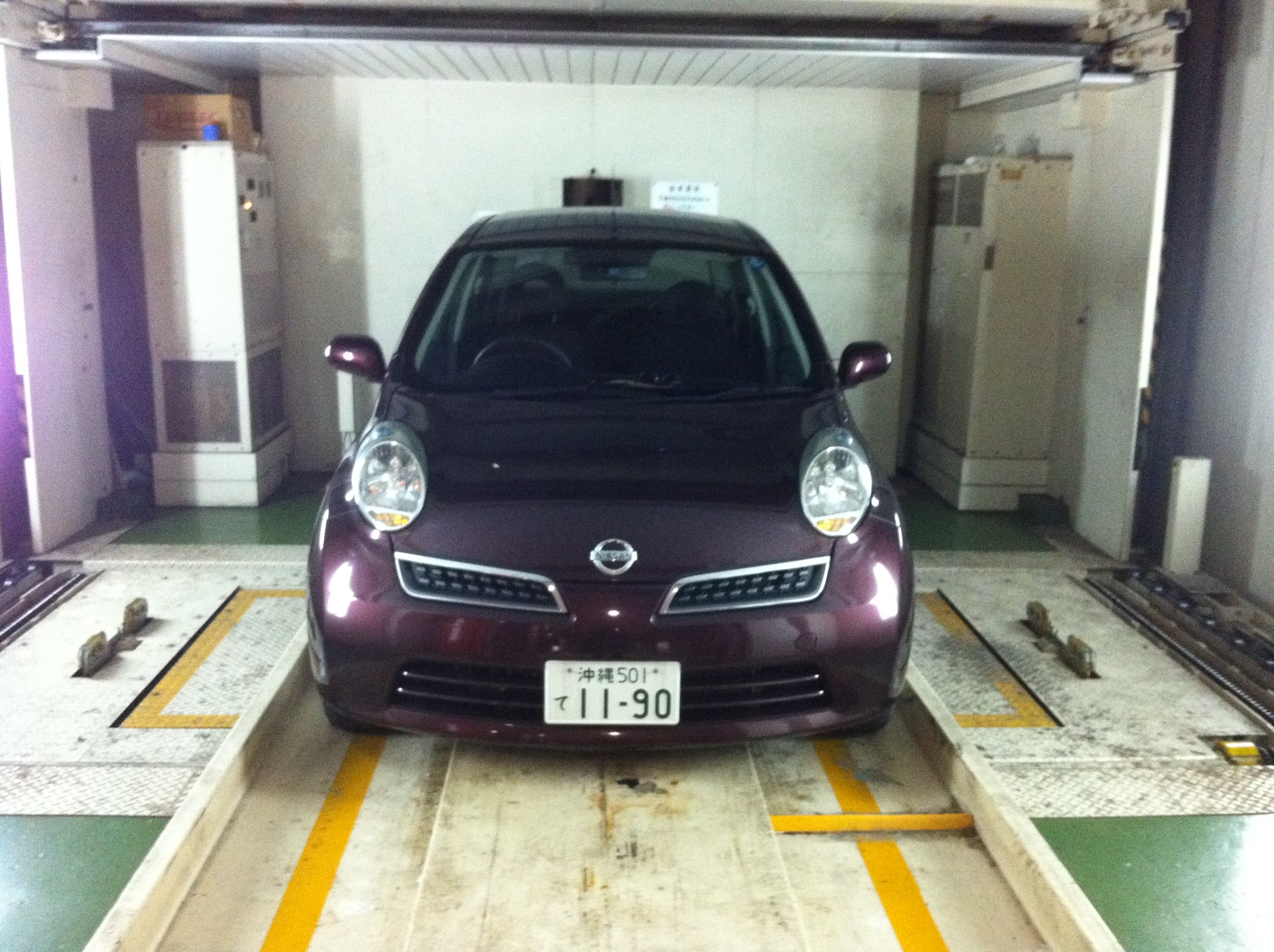 I park my car in an amazing place. It is a high rise building that essentially contains two car elevators. You drive your car into the elevator and get out. The doors close and your ride is whisked up into the upper reaches of the building. Note that your car faces the front of the elevator when you drive it in.