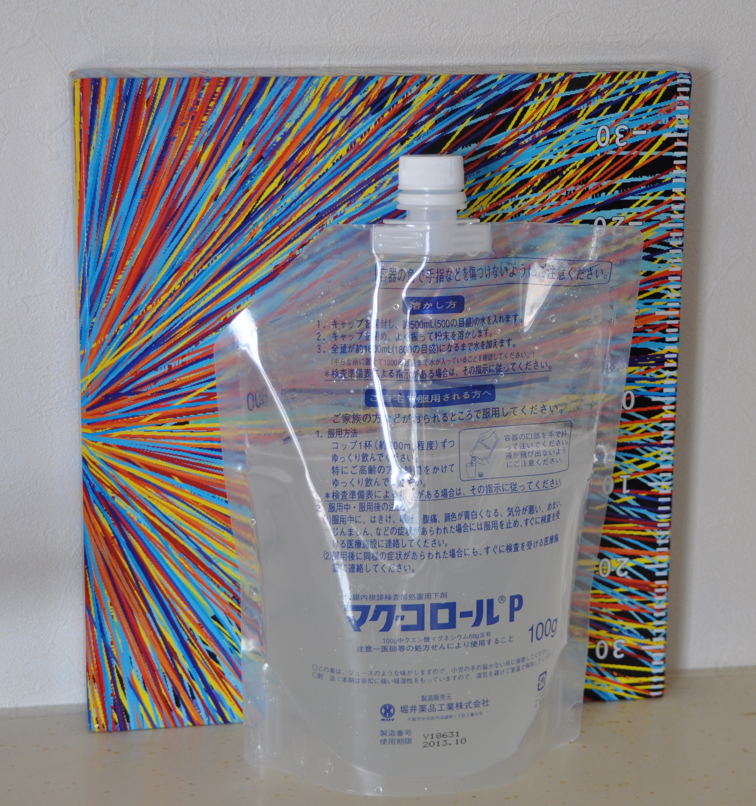 The preparation start the night before when you swallow a huge dose of Japanese laxative, which comes in a bottle that looks as if it is for eye drops. You awake with only one thing on your mind. You then mix up 2 litres of slimy liquid and drink it. This keeps you very near the toilet all morning.