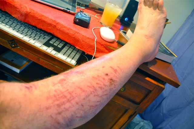I return to Cape Zampa to dive. The sea is still boisterous but I am with companions who leap in  sans souci. Amazing dive etc  until it is time to get out. There is a deep water channel that you glide along until you spring penguin-like onto the shore. I miss it and end up on a bank of coral. As I struggle to my feet a wave crashes into my back knocking me over and rolling me along the coral. With typical lack of forethought I am wearing a short-legged wet suit and no gloves. I old-man-like try to get upright in the maelstrom – not so easy with tank and fins and stuff –  but here comes another roller and I am grated over the coral like a lump of parmesan over a cheese grater. Anyway I finally make it to the shore with well lacerated legs and hands innit. I bleed like a mxxxxxxxxxr to the glee of the sightseers who have come to visit the famous lighthouse.