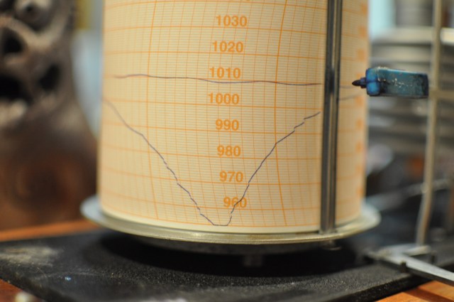 There has been a mega typhoon through whilst I was away. Rats – I love typhoons. I run to the barograph to see how low the pressure got. Whoa! Gold medal to Bolaven!
