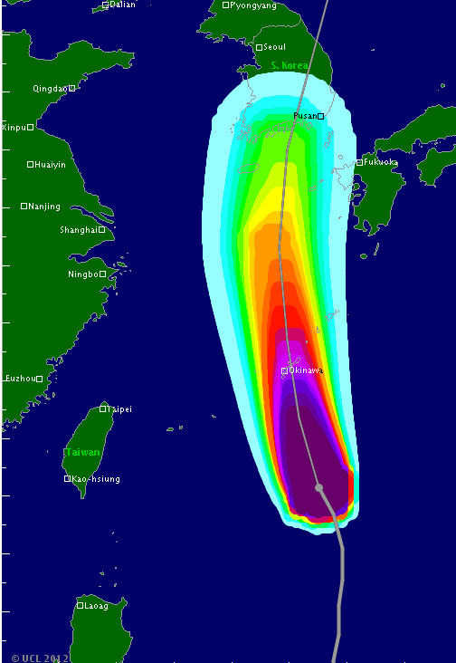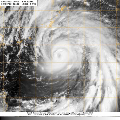 “Bottom line: Super Typhoon Sanba, arguably the strongest storm to develop across the globe in 2012 is packing winds around 160 mph, and peaked with sustain winds of around 175 mph on Thursday, September 13, 2012. Sanba will push north into Okinawa, Japan and eventually push into South Korea as a Category 2 storm next Monday. The good news about Sanba is that the storm will likely weaken as it pushes over cooler waters. Of course, intensity forecasts are unpredictable, so residents that are possibly in Sanba’s path should be prepared.”