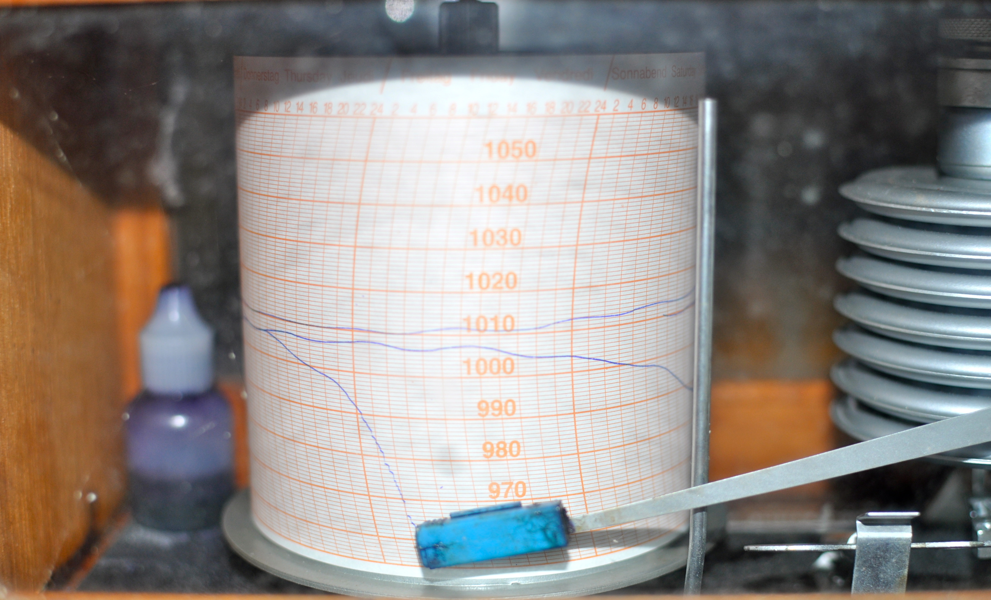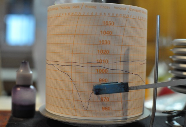 Unfortunately the real fury of the typhoon came in the early hours. I got up at 6:00 to check the barograph and generally see how things were progressing. Barograph still going down with much howling and wailing from Sanba.