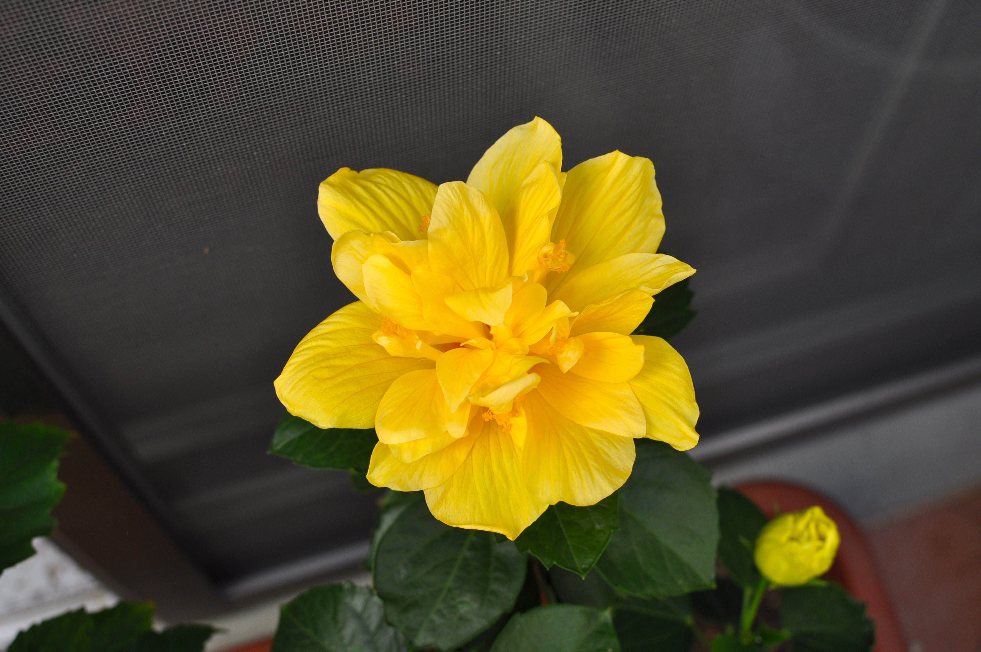 The weather is perfect. No humidity, 28 degrees, blue, blue. I get up early and look at my new hibiscus.