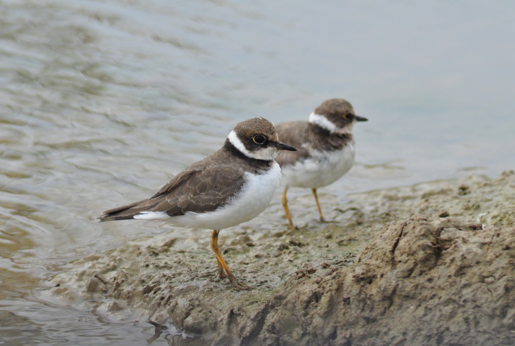 Kentish Plovers? I now think these are Ringed Plovers because of the yellow legs and ringed eye. However the bill is the wrong color. So in the end they are probably Little Ringed Plovers. The images in the book are inaccurate.