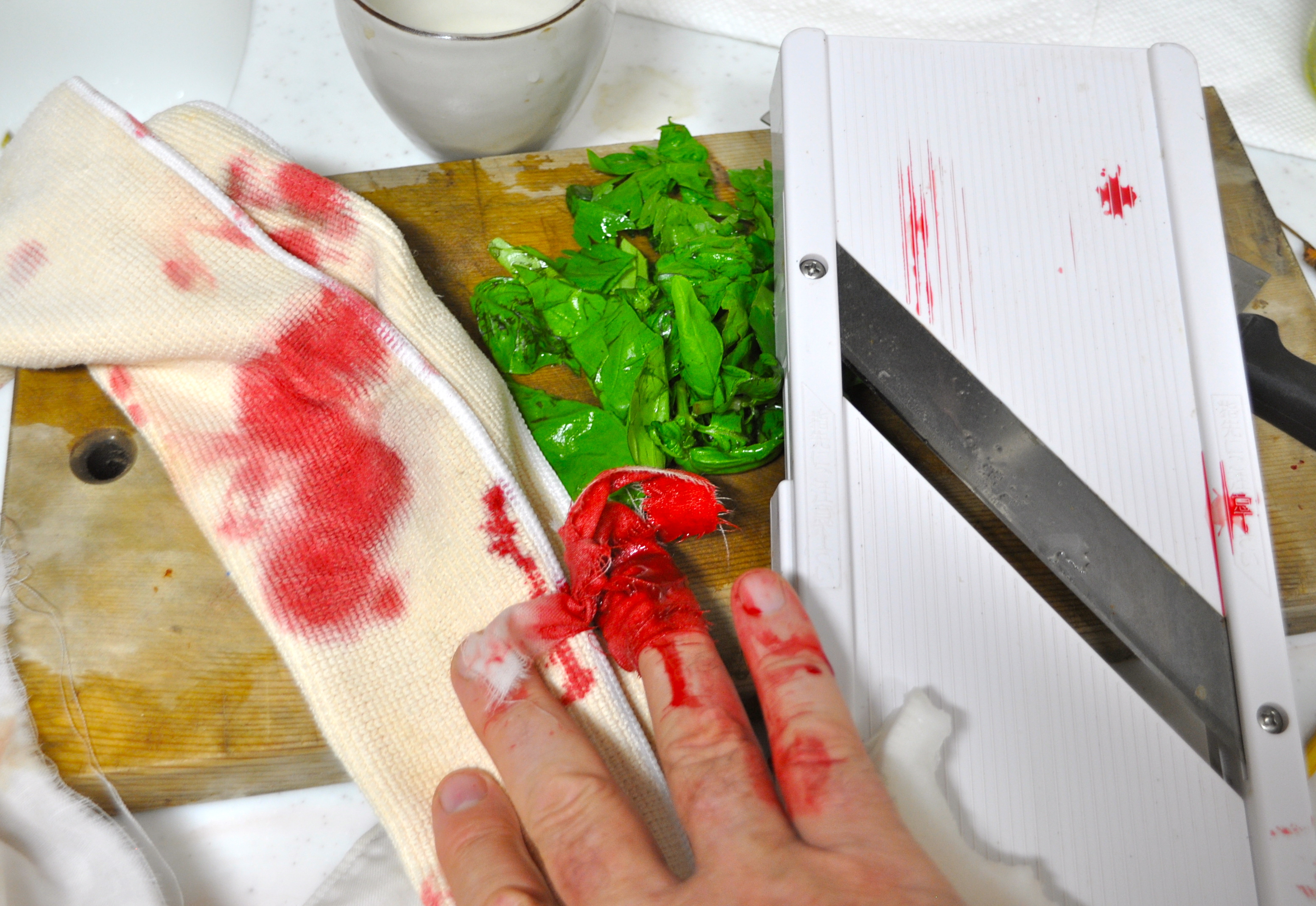 At half time I slice the top off another finger with my deadly Japanese vegetable slicer.