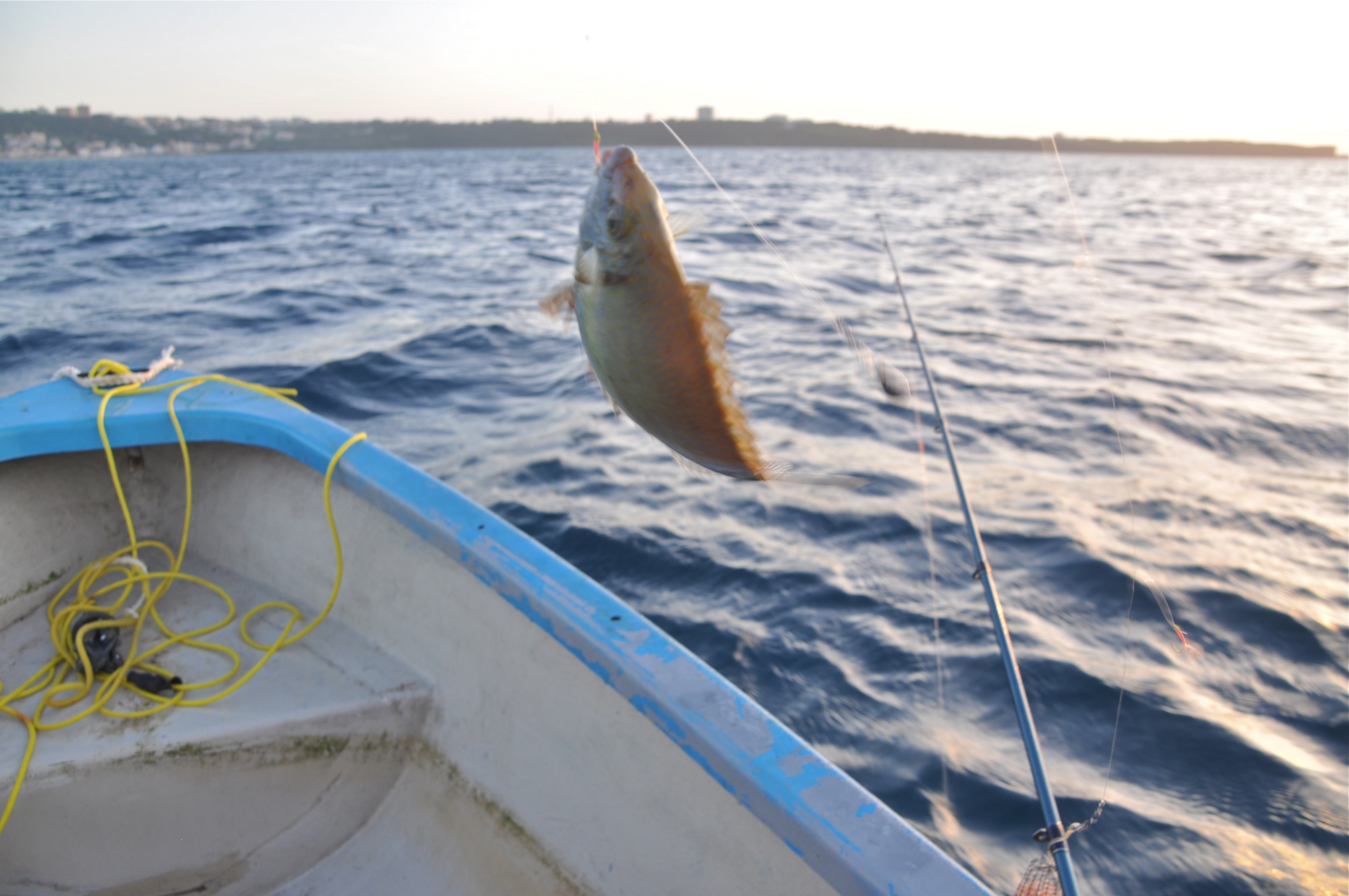 I gently fish in one Okinawan style. This means filling a little wire basket with tiny dead shrimp that you can buy at any corner shop. Once underwater the shrimp in the basket thing are released by jigging on the line and float downwards. Float downwards? Anyway below the little basket is a string of lures that look like shrimp. Fish in feeding frenzy bite these and are busted.