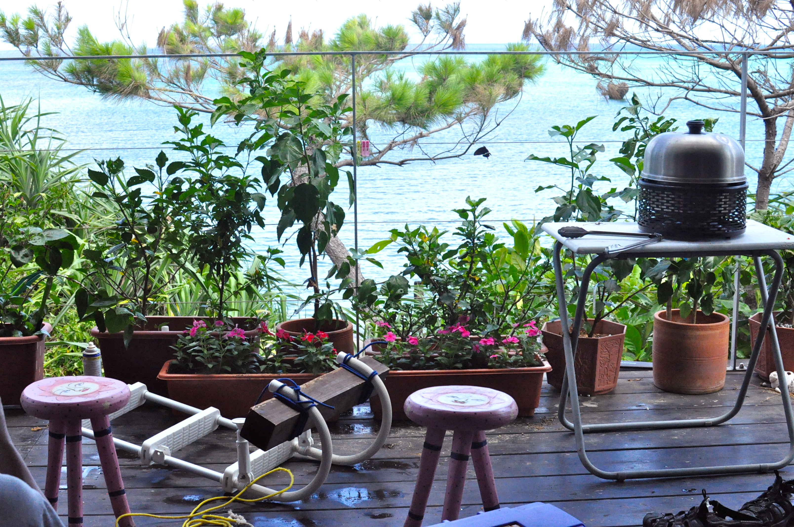 I position the stairway to heaven on the boat whereupon it becomes clear that the horseshoe like brackets that go over the stern are far too wide. No problem as I lash a big lump of wood to the horseshoes thus obtaining a snug fit.