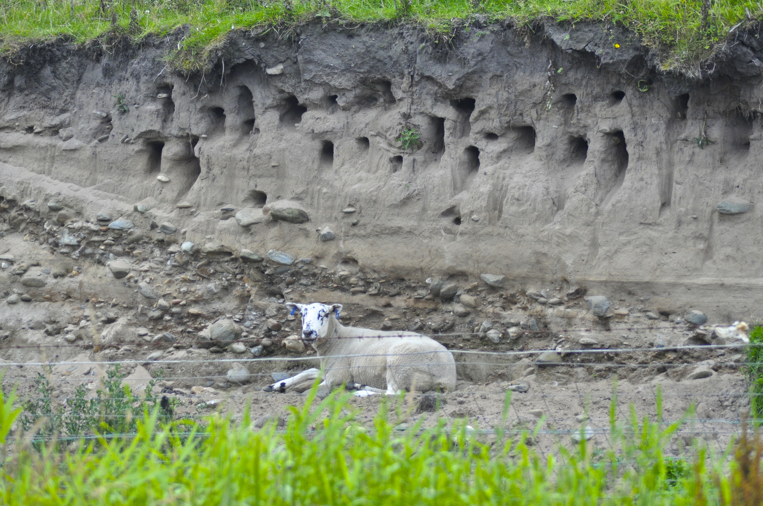 Sheep with blue ear rings rests under the burrows of very rare Sand Martins