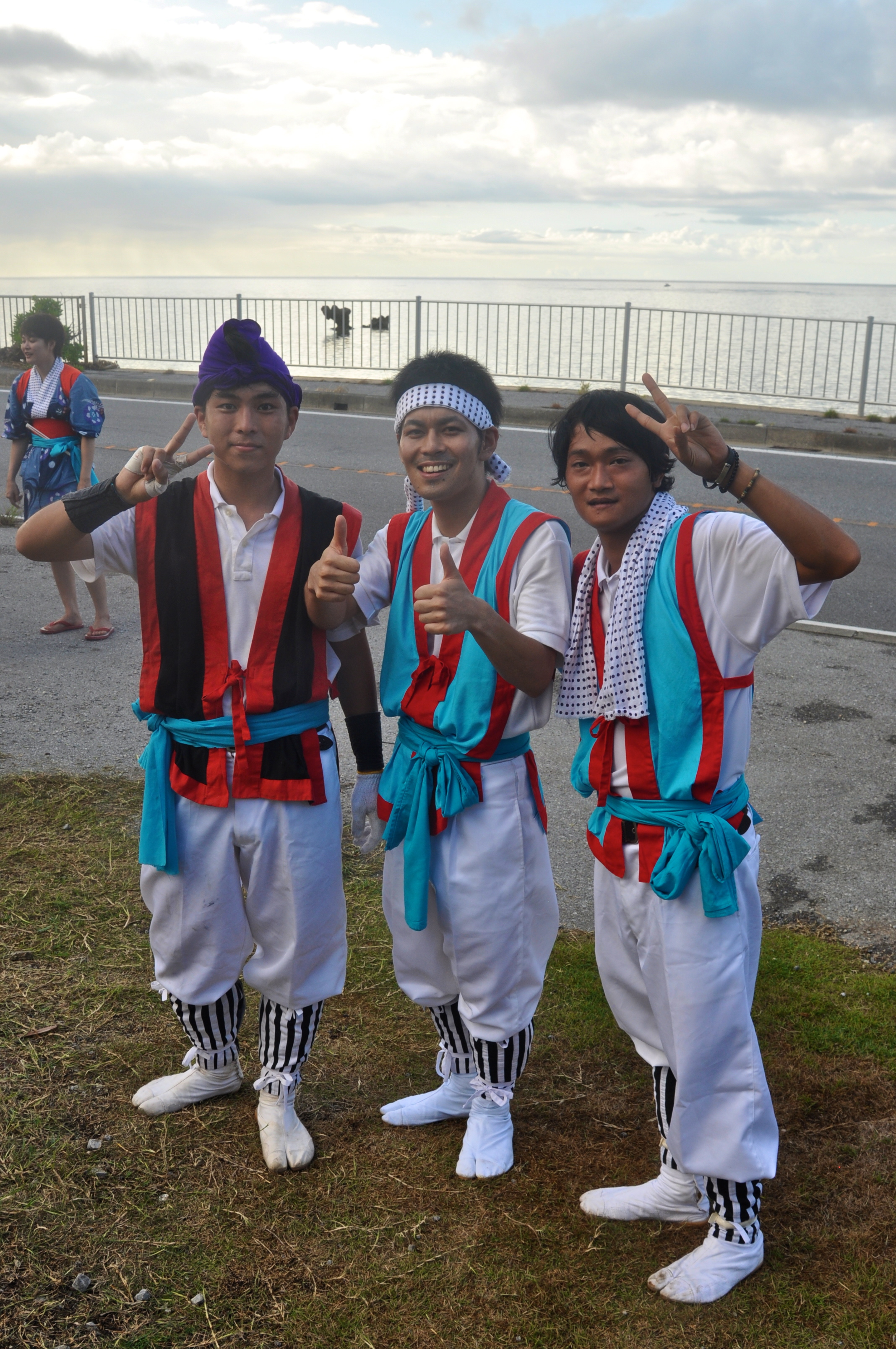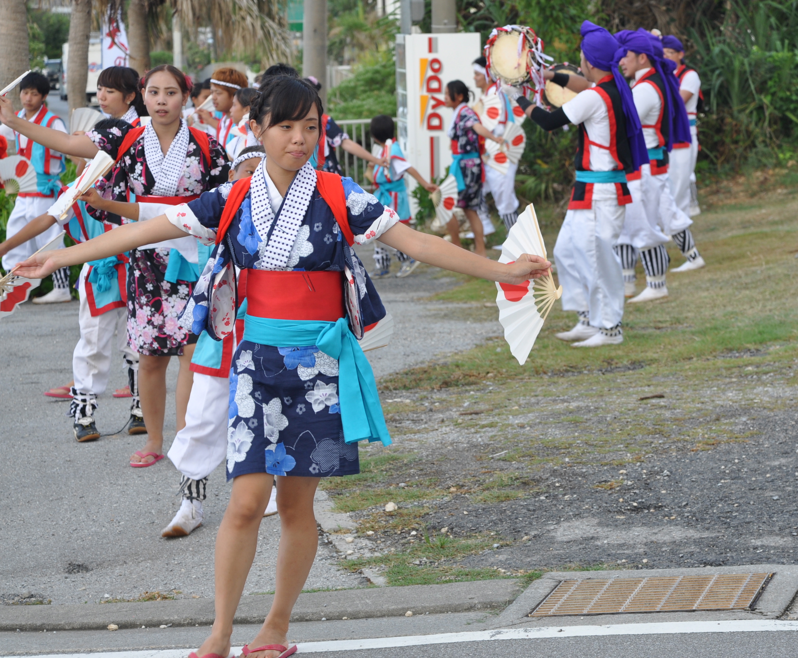Saturday night I hear the beat of the drum. Venturing out I see a big Eisa dance group doing their thing just up the road.