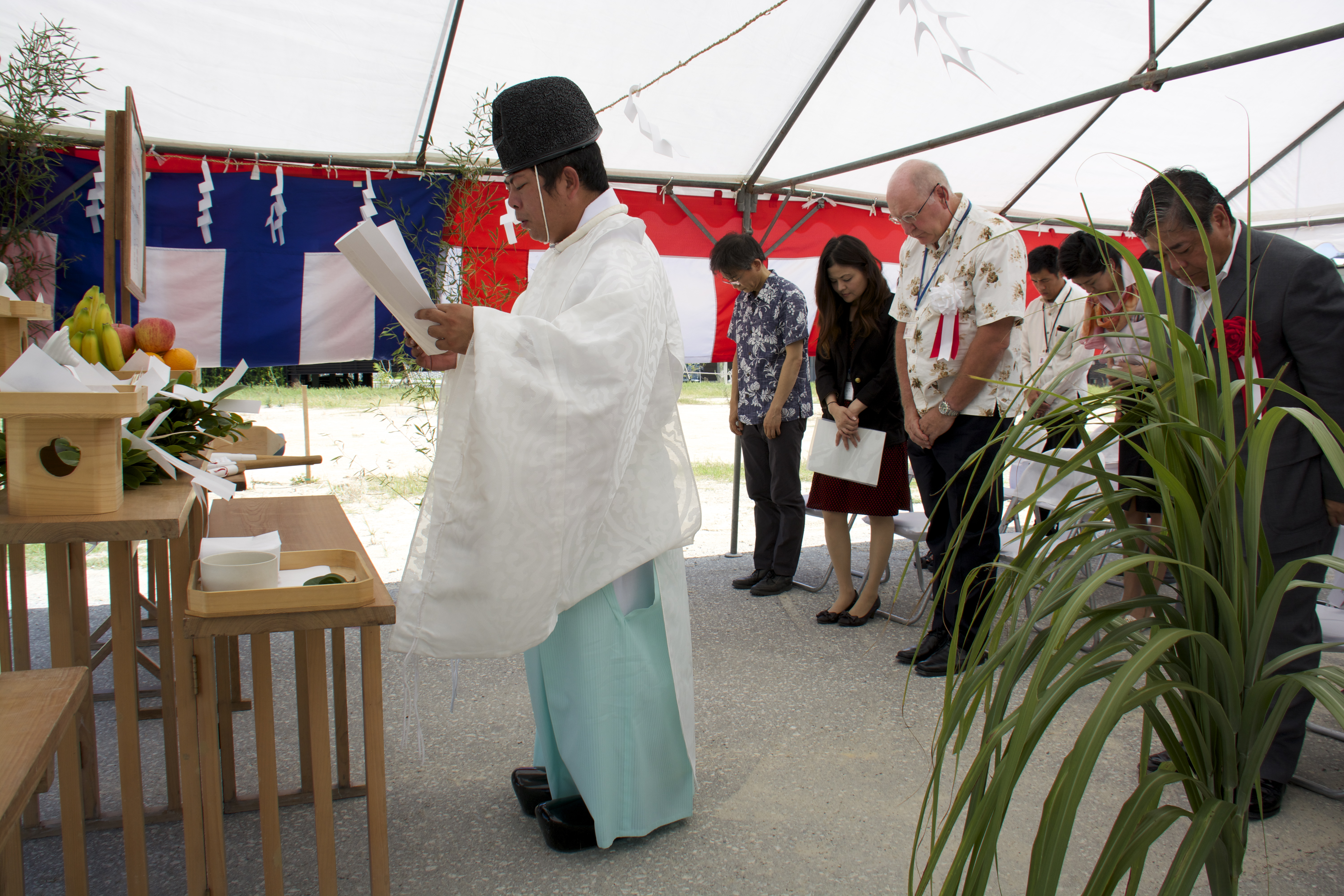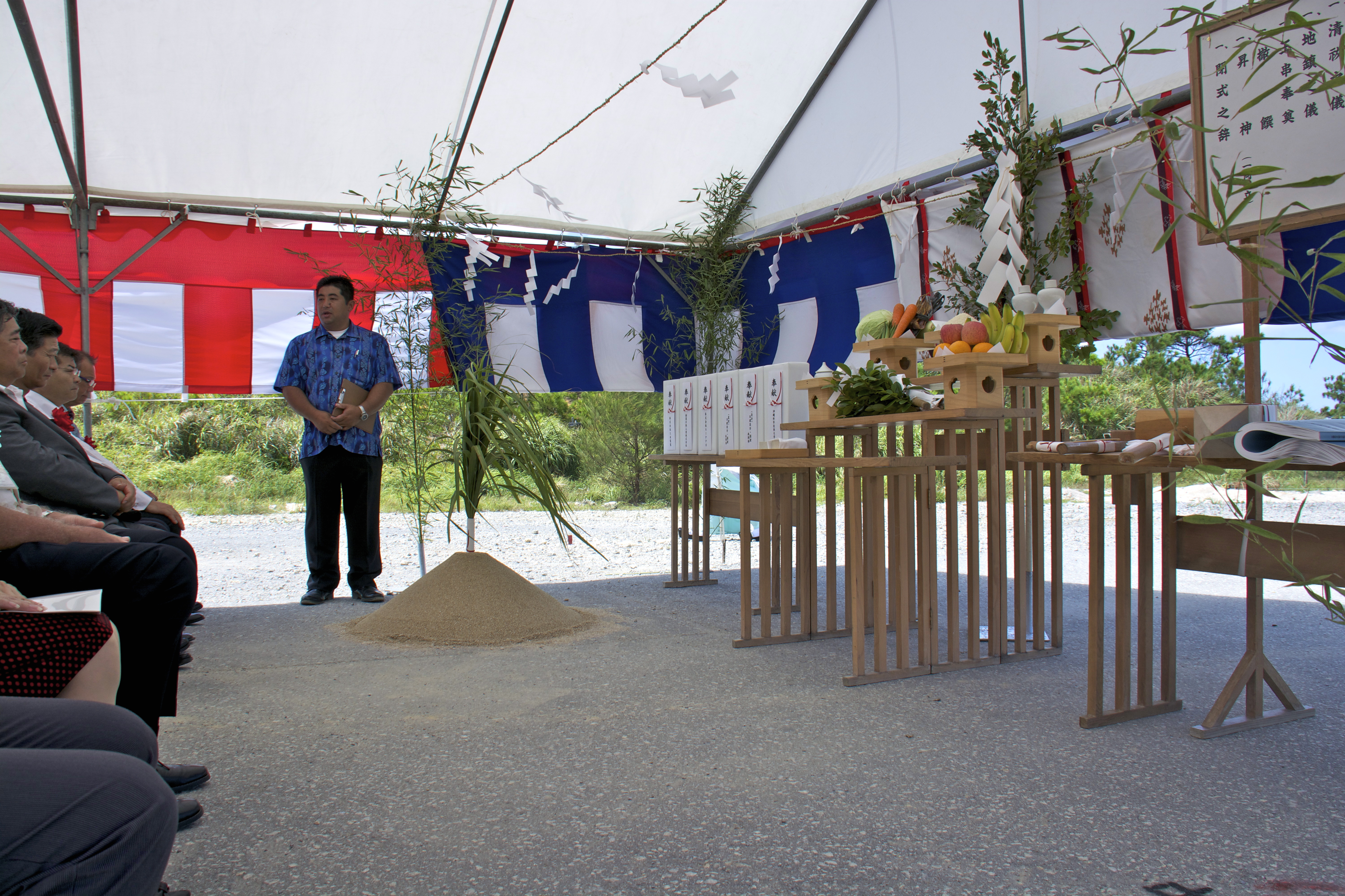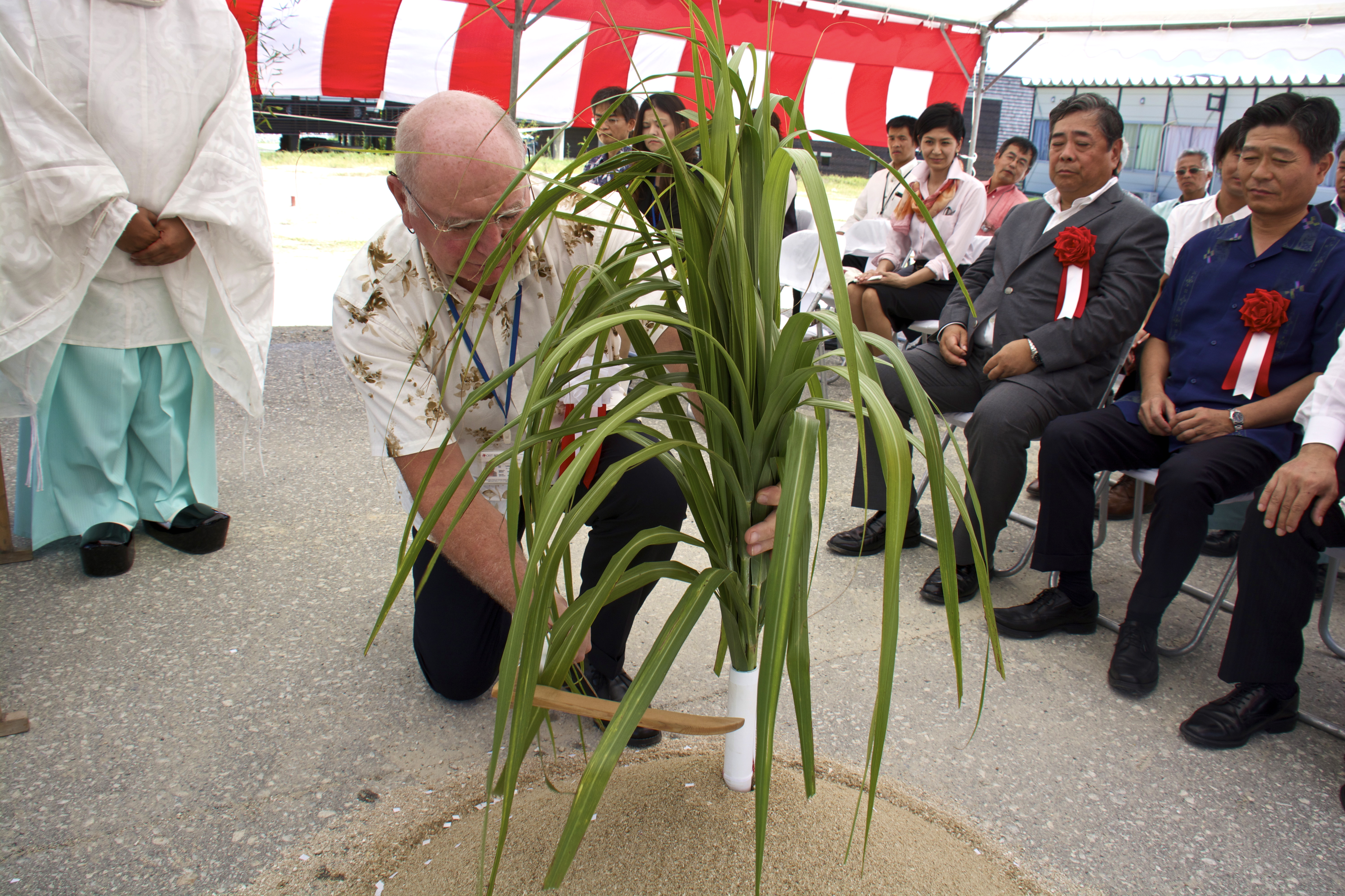 Today I had the privilege of representing the university at the Shinto ceremony to prepare for the construction of our new Child Development Centre. Before the diggers rumble in, the spirits who inhabit the place have to be warned and apologized to for the disturbance. There is an elaborate ceremony in 32 degree heat during which there is a series of incantations from the priest, miming of slashing, digging and hammering by the major players, a blessing of the four corners of the site, offerings of branches the significance of which I have forgotten, then finally sake drinking. It takes about an hour. It is really hot!
