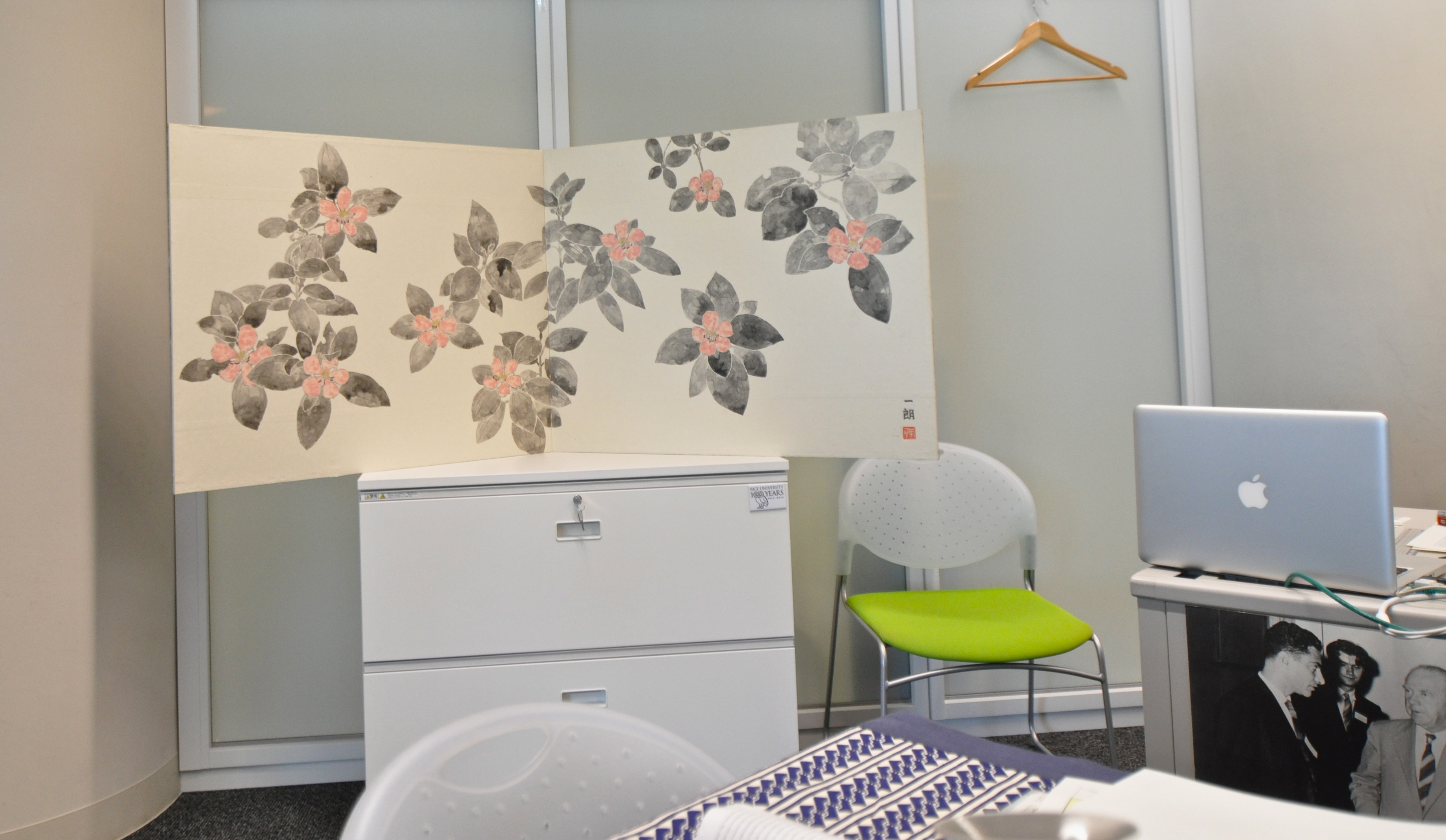 I also got temporary possession of a beautiful hand painted screen, which made my office look ultra distinguished.
