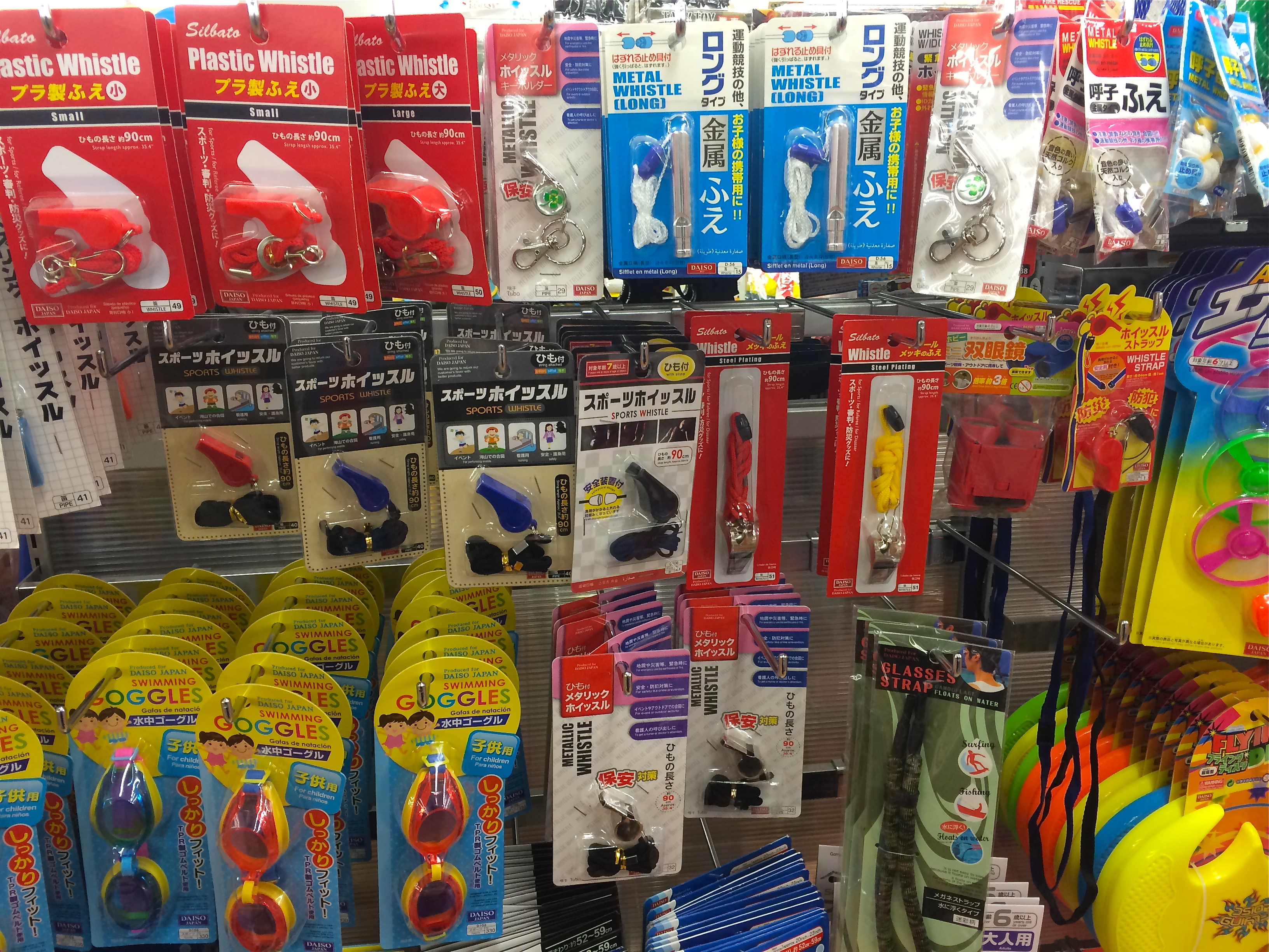 It being Japan, there is of course a huge choice of whistles, long, short, red,black, sport, camping, kids, grown up, key chain, silver plated, and with or without shamrock.