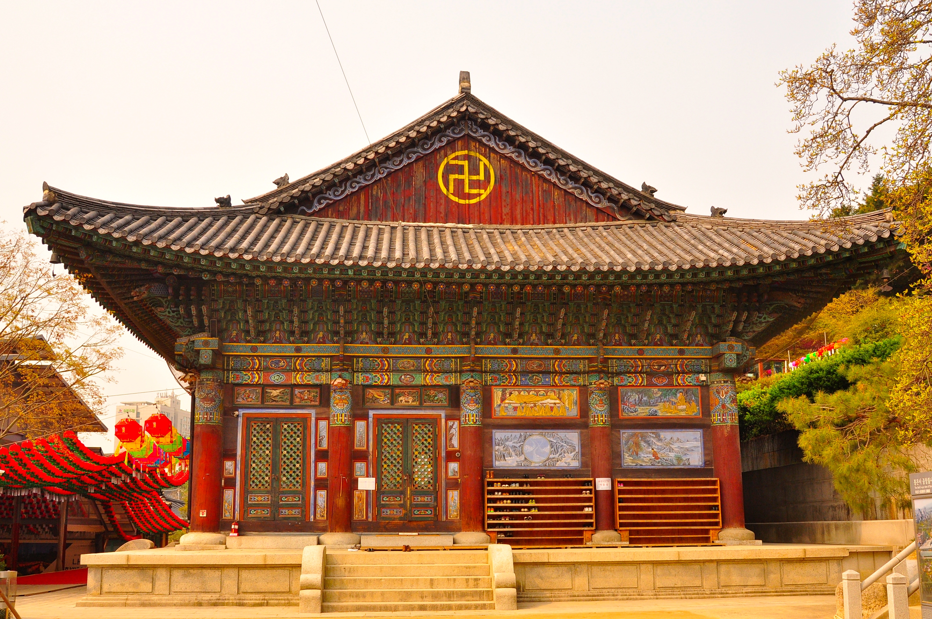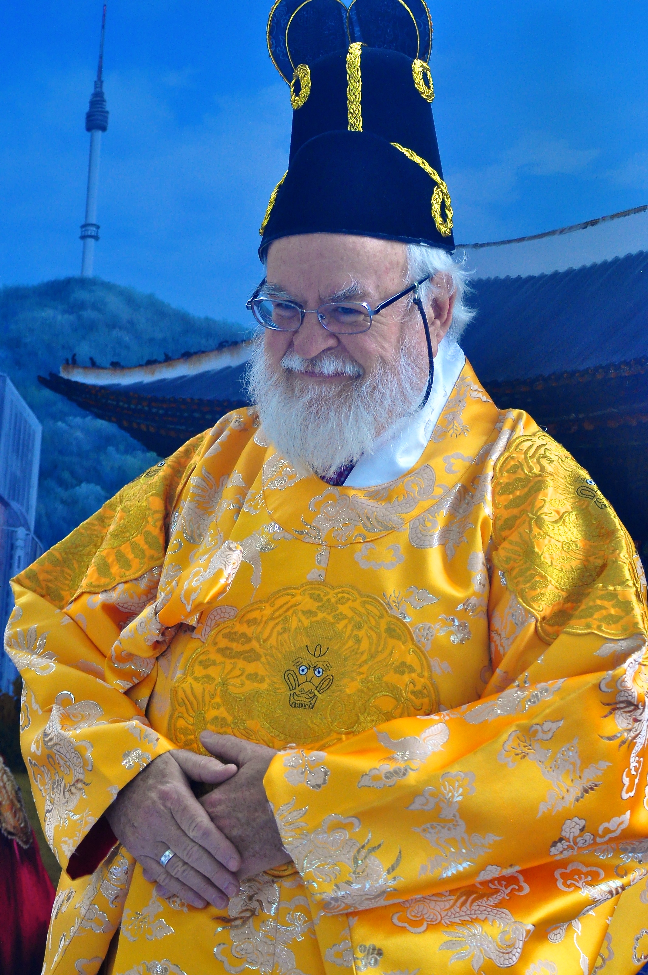 The conference/exhibition center where I am spending my time at the moment is in Korea and is called Corex. I wonder why? Anyway, it is well sited as just across the road there is a Buddhist temple. Today I wander off from the talks, which frankly I do not understand, to visit.  Before I leave I take  a photo of Bebo in Korean gear.