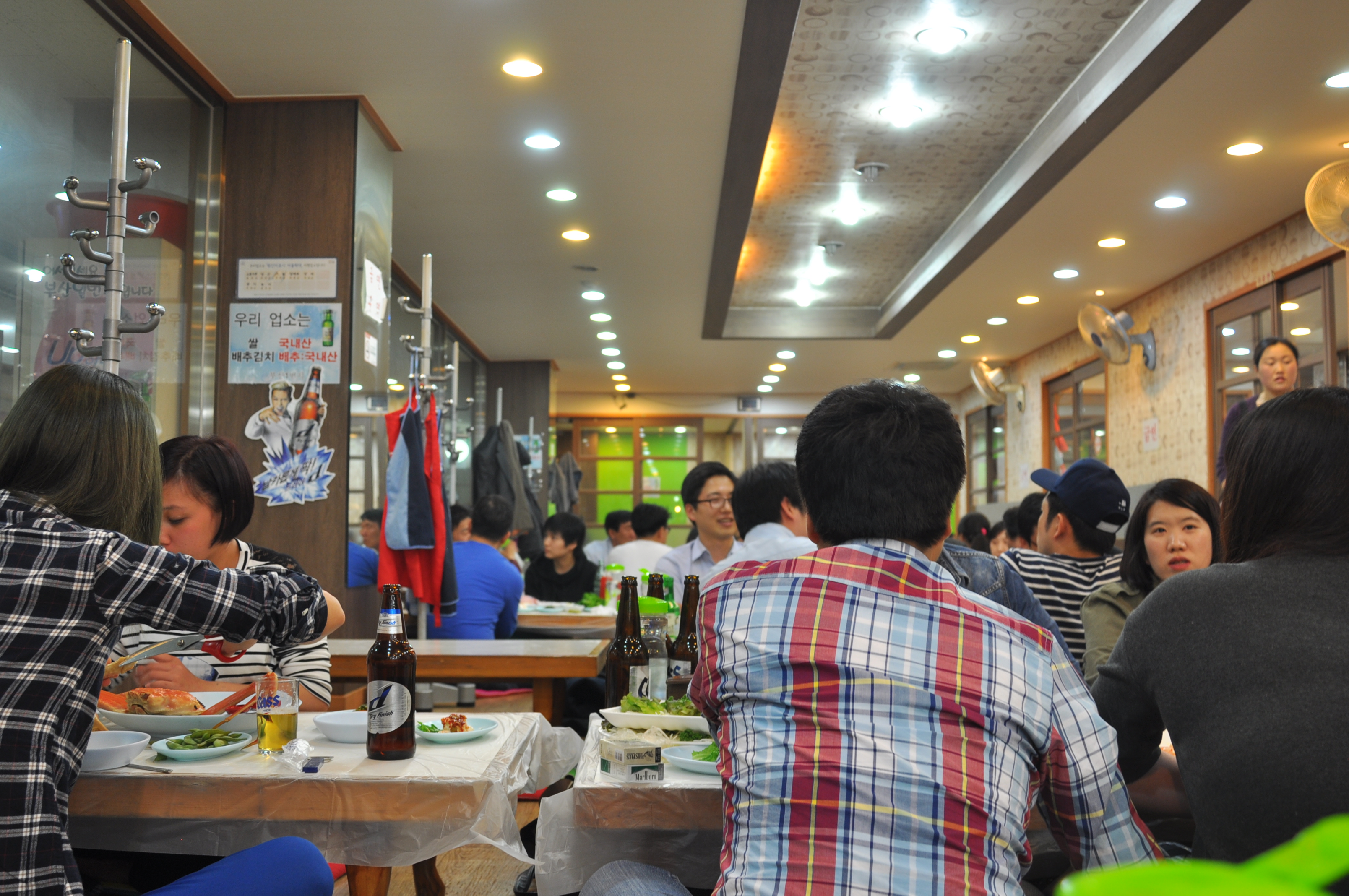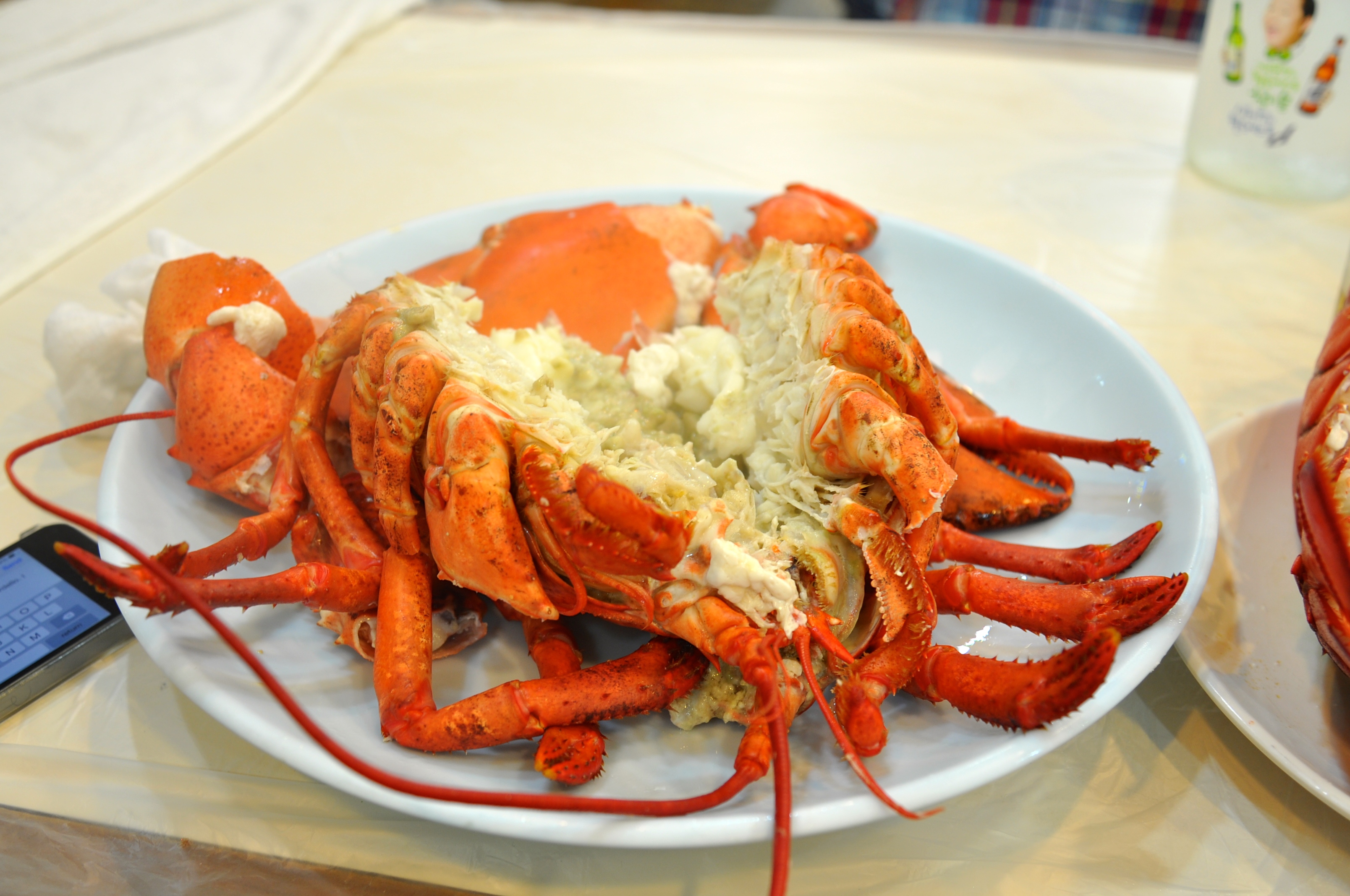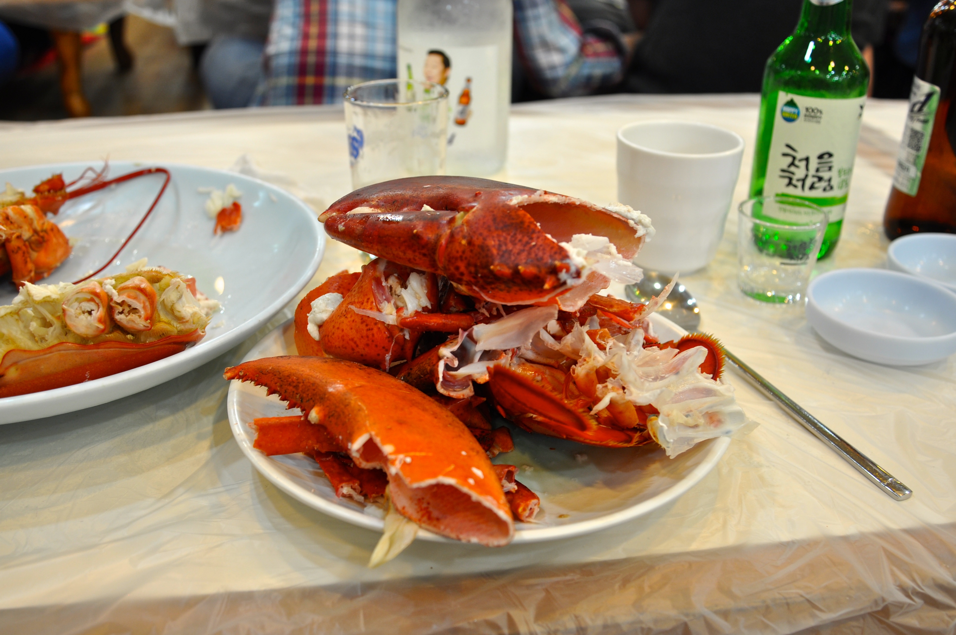Off I go through strange passages, slaps and stiles until I come to a restaurant. They grab the lobster and sit me down on the floor. This is only one of  a dozen or so places that are full of Koreans having a REALLY good time. They are gobbling down the best seafood and guzzling shochu. These places are raucous. They are very welcoming to me and we discuss football as best we can.