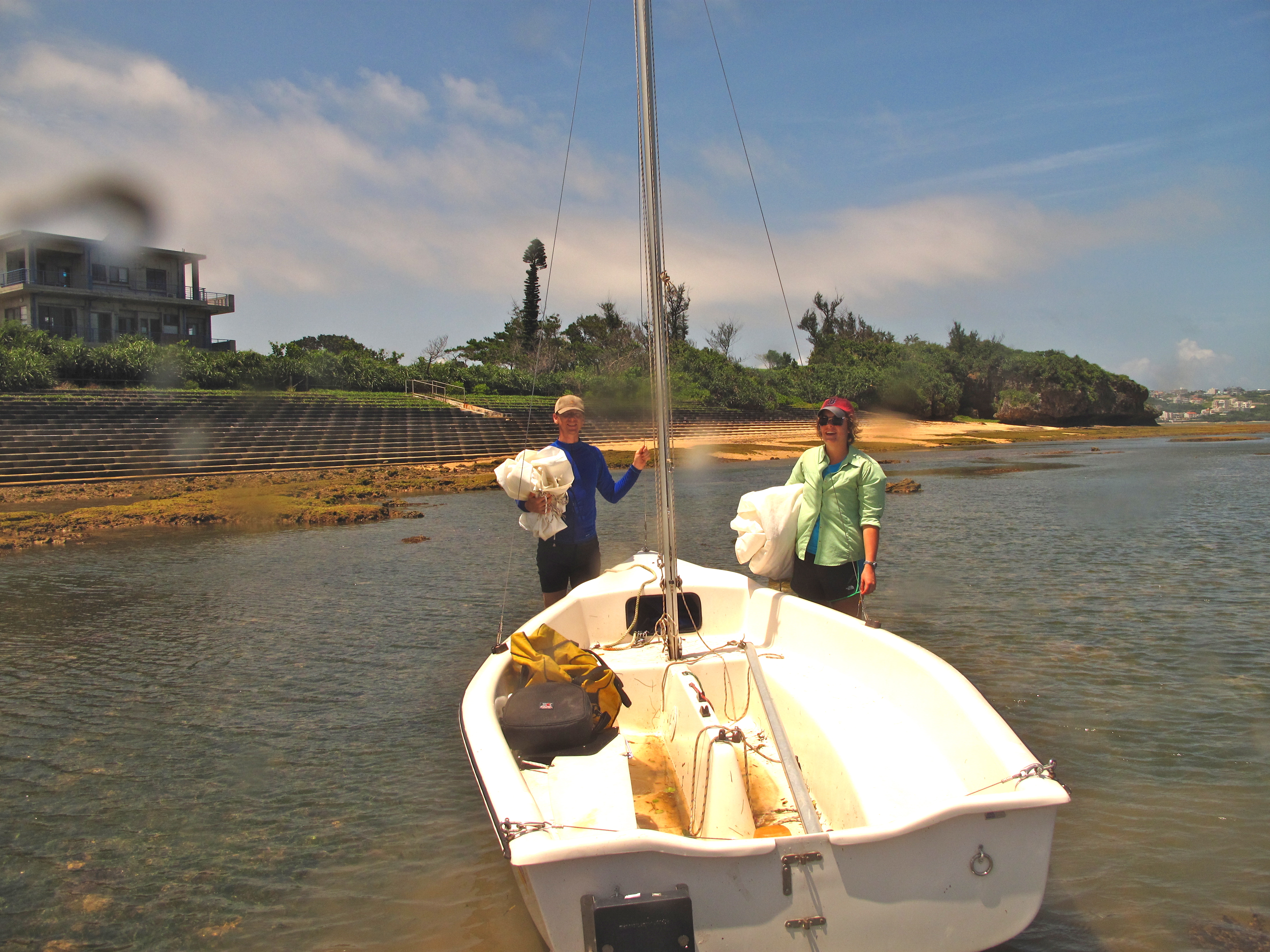 Yesterday, we, Poncie, Micheal and I, take Dileas out having rolled her down from her typhoon hidey-hole. The tide is still pretty high when we leave but after a very windy sail, heavily reefed, I am surprised to see that the tide has like totally gone out and access to the home mooring is pretty much blocked by murderous coral. I head for the channel but of course miss it and we scrape over the top of the reef with much banging of center board and rudder. Fairly stimulating.