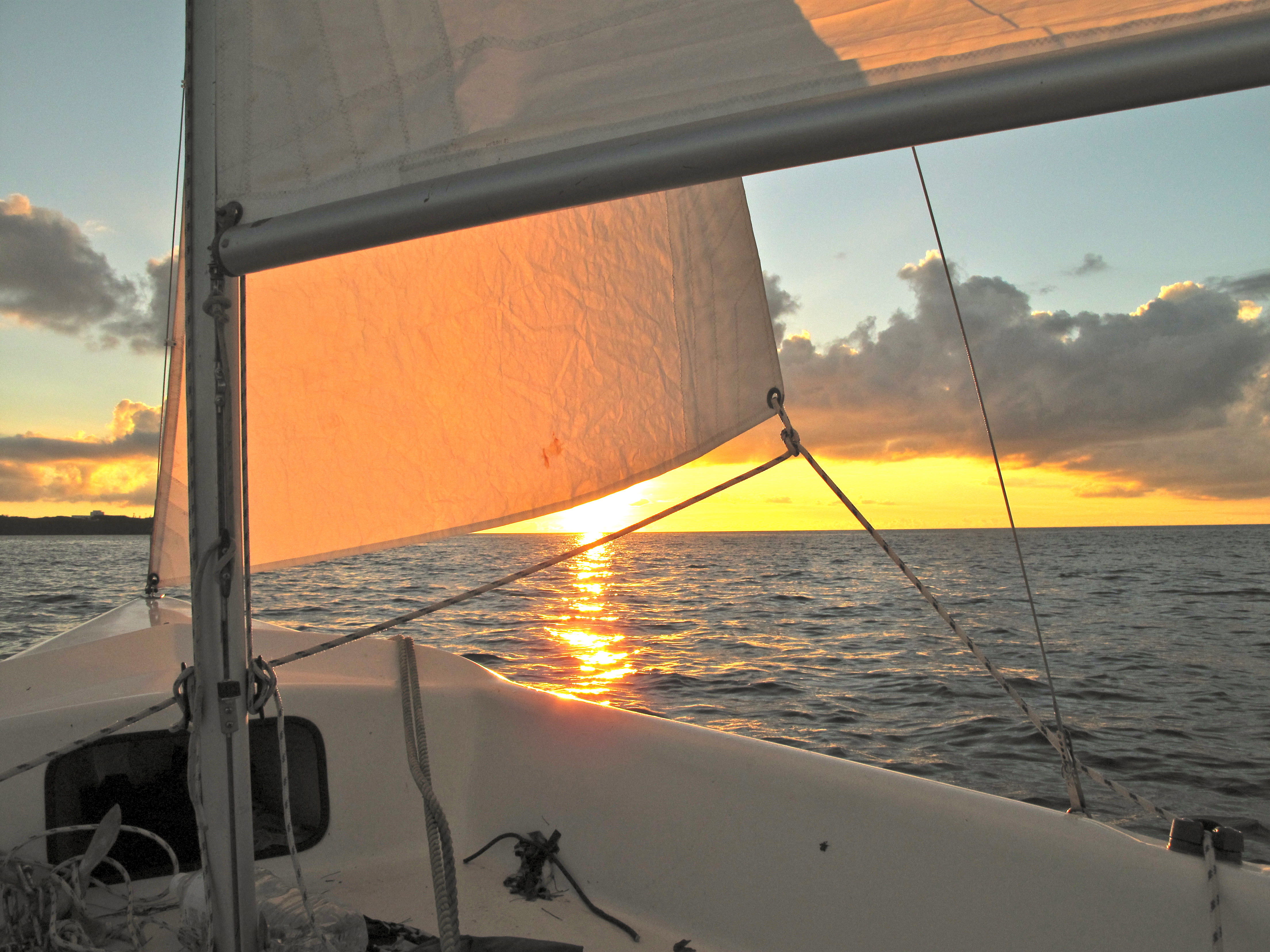 The breeze is very light and moving away from the mooring is gentle stuff. Once away from the wind shadow of the hill behind my house, the ideal after- a -day -at- work-breeze is revealed. Under full sail we cruise into the sunset.