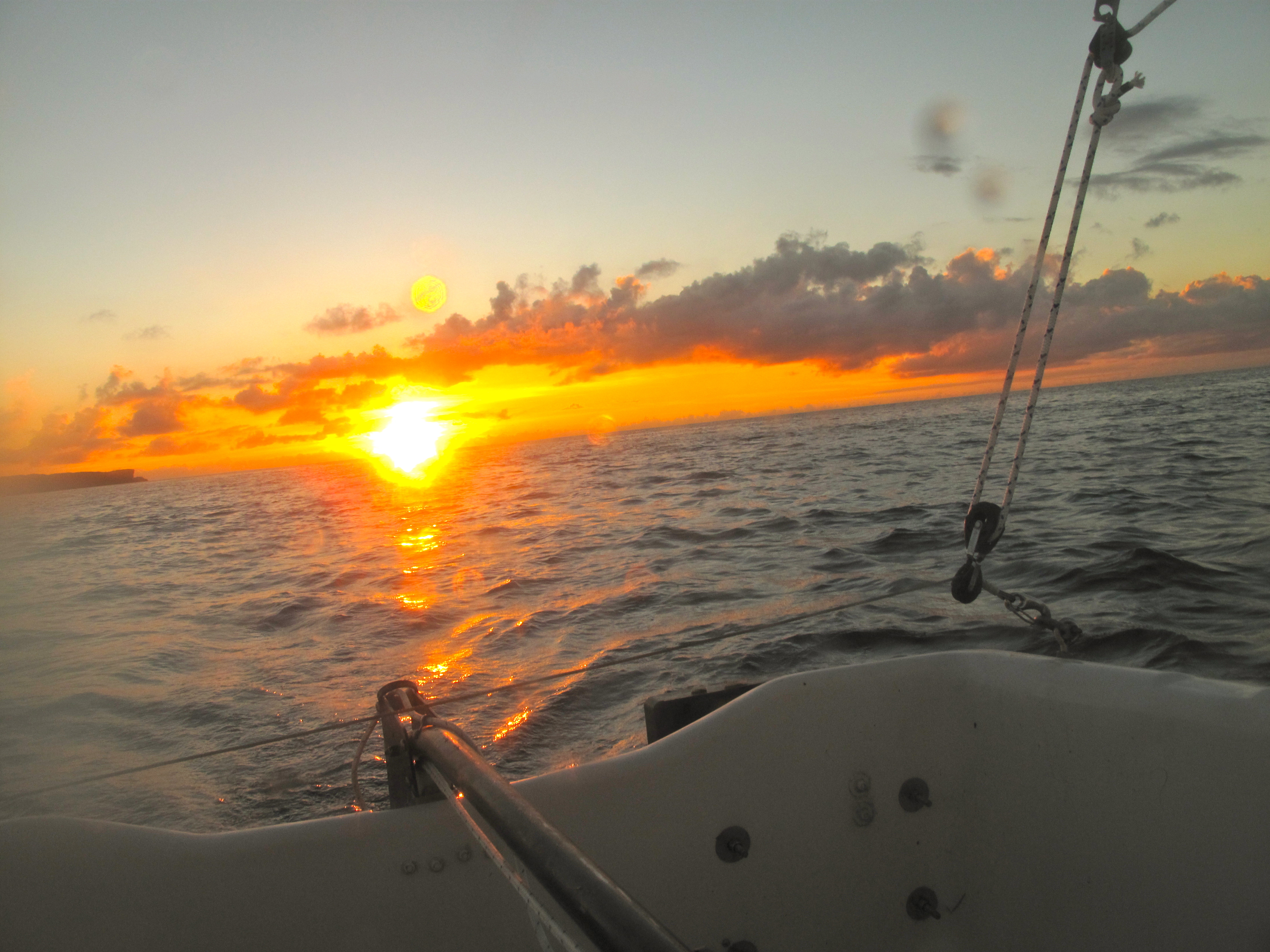 After watching the sun go down, watching the terns dance and the flying fish er fly, I head homewards. What wind there is, is against me. Are we downhearted? No!