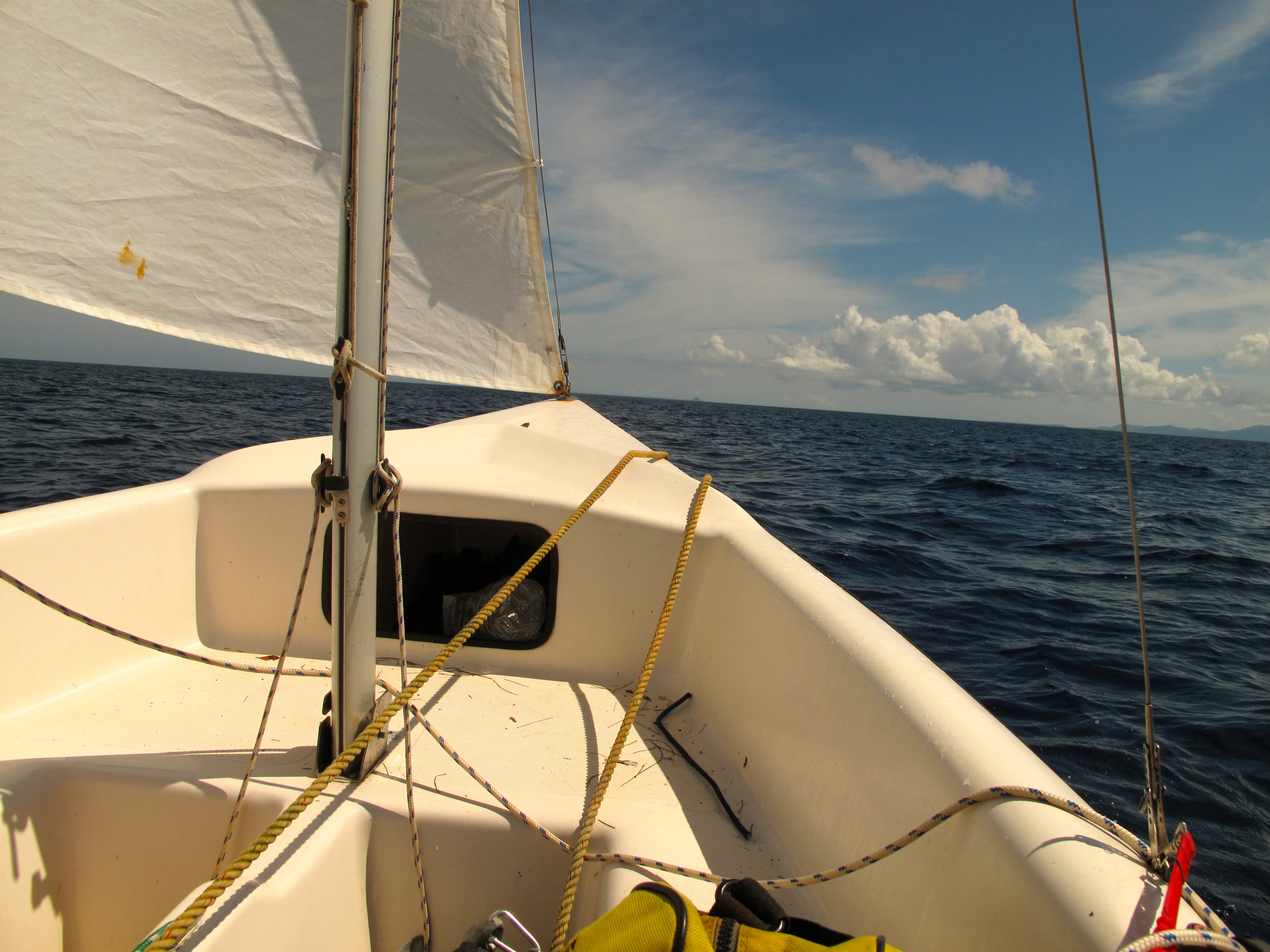 Who cares, it is time to go. Dawn is rising as I load up and raise sail in a silent, windless morning. Can I get away from here? The tiniest zephyr pushes me away from the island into the wild and wistful ocean. Success!