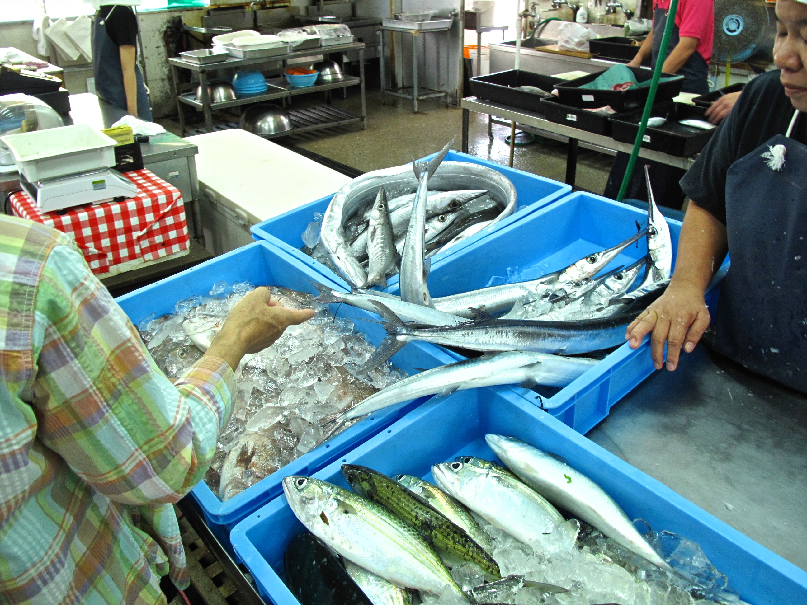 Fishmonger, whoremonger, costermonger, ironmonger, hmmm can’t think of any more. Anyway it is Saturday so I go to my er fishmonger. I use this term as it suits the enterprise well. It is essentially a staging post between the fishing boats, the fish shops and fish bits in supermarkets. Its main function is to make sashimi. I am very encouraged that it is all done by hand.
