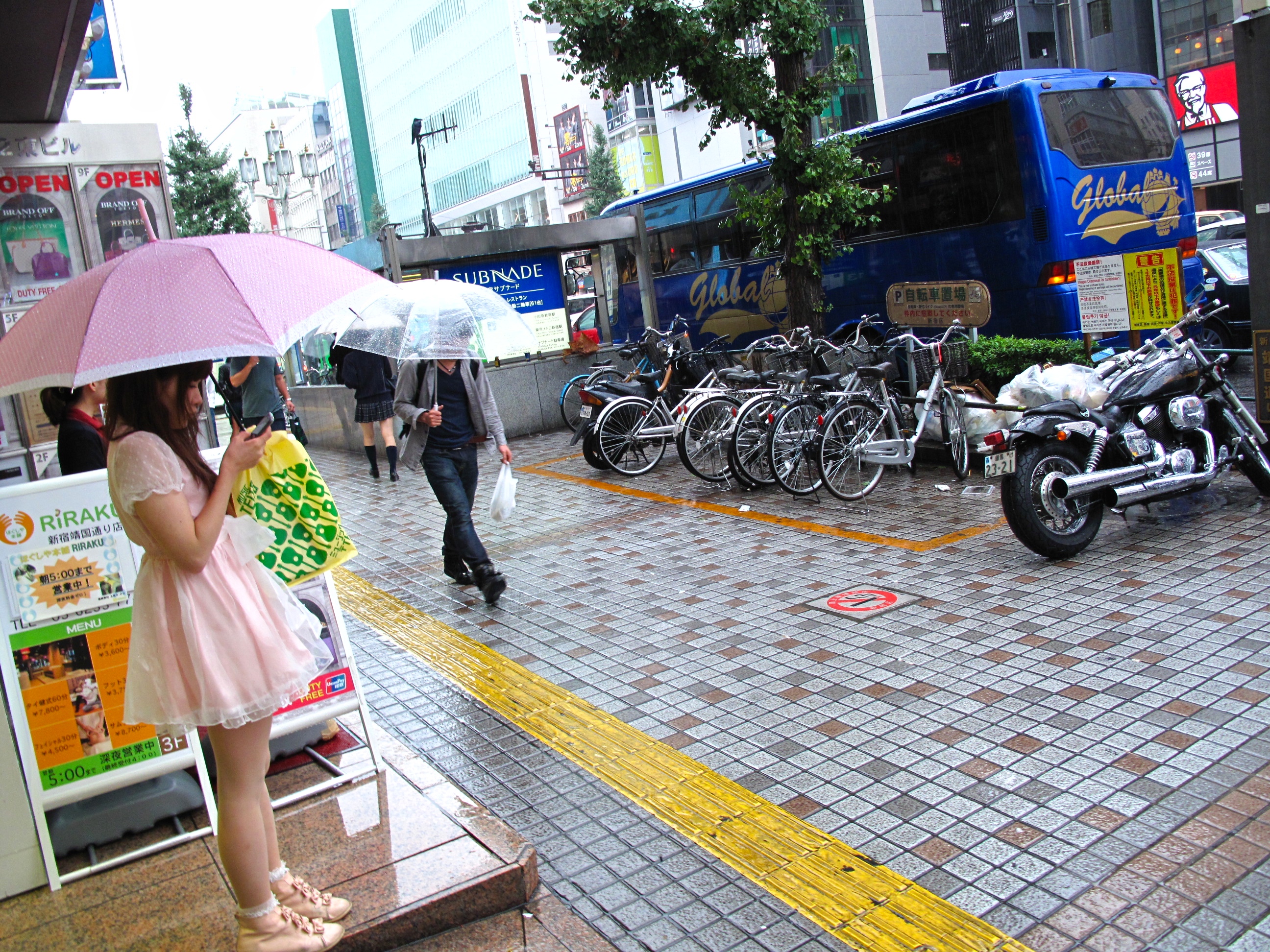 It is lonesome on the streets of Shinjuku in the early afternoon on Sunday with no place to go and the rain pounding down.