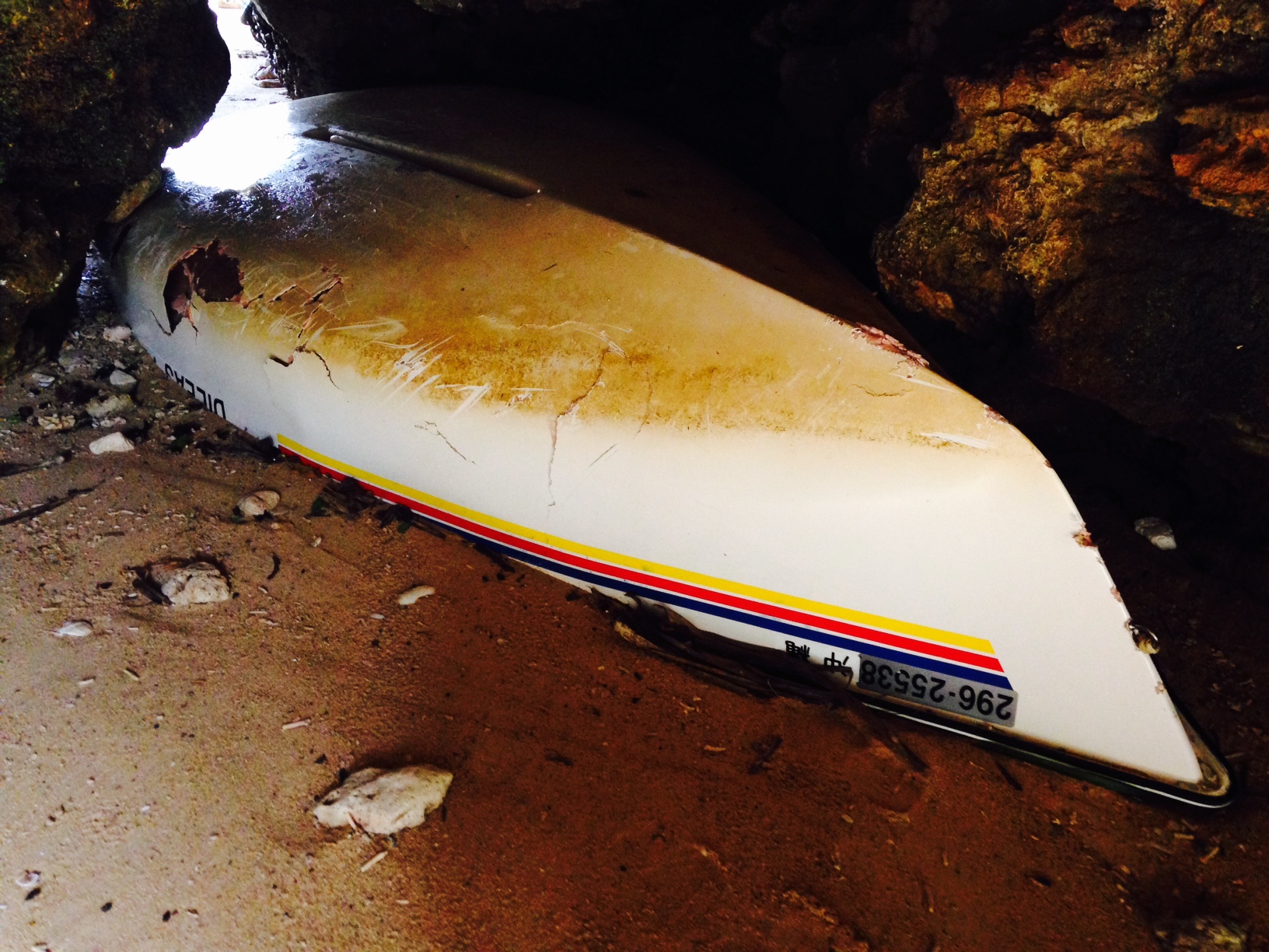 The next bad news: it had clearly had a very rough night, and it is going to take a lot of work with a sander and a fiberglass repair kit to make it seaworthy again.”