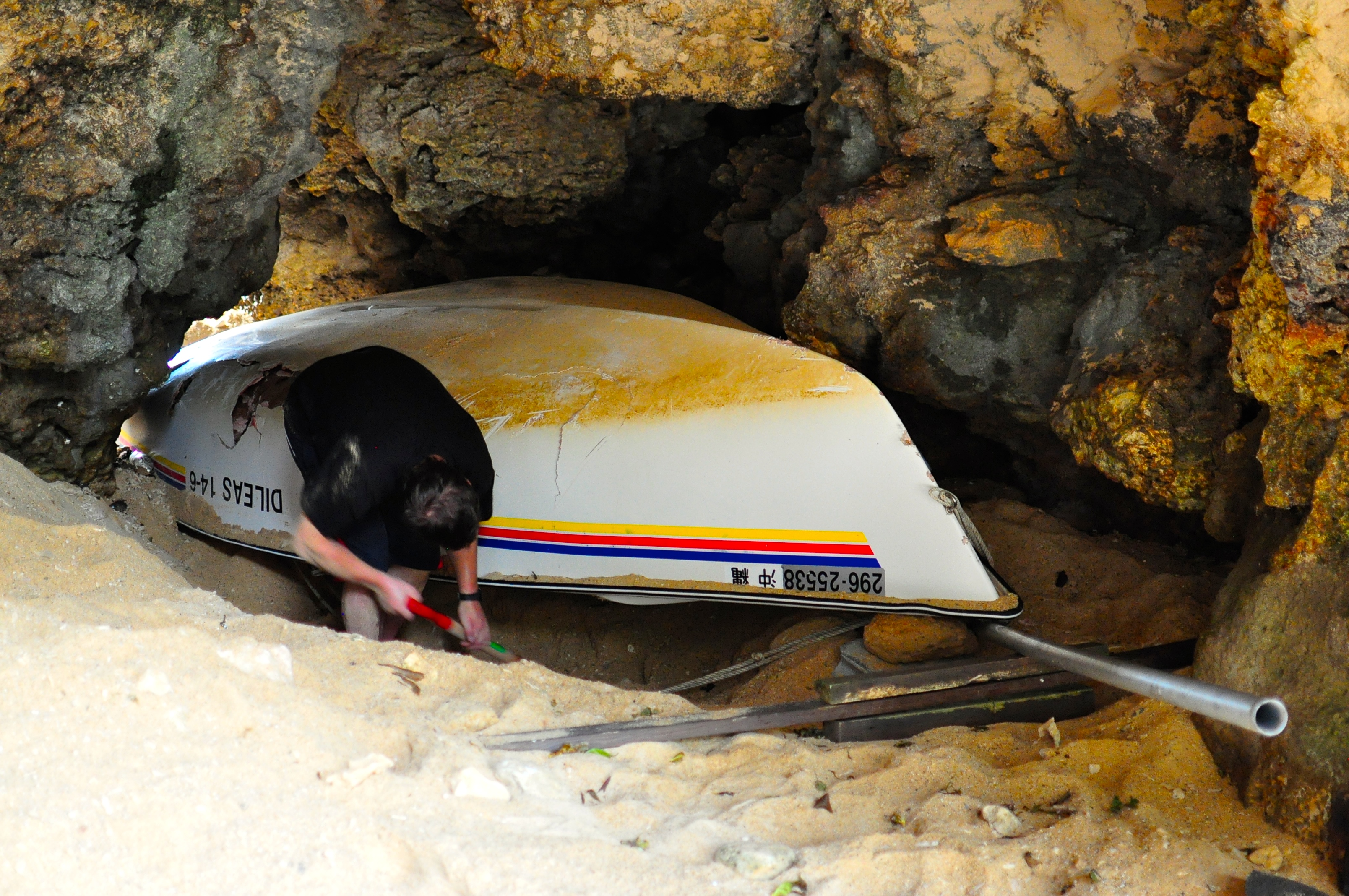 Forget it. We could not move her at all. It soon became clear that the poor boat is not only badly beaten but is also filled with about 20 tons of sand.