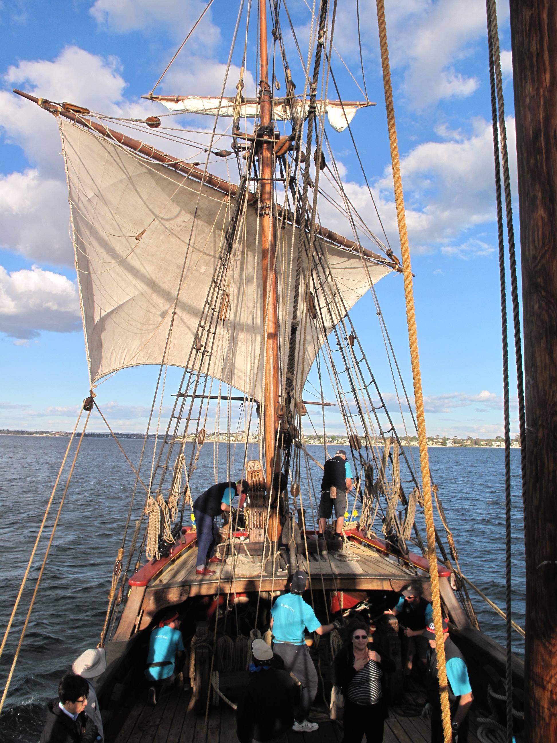 Even with just the two sails set, Duyfken swoops towards Perth at around 4-5 knots.