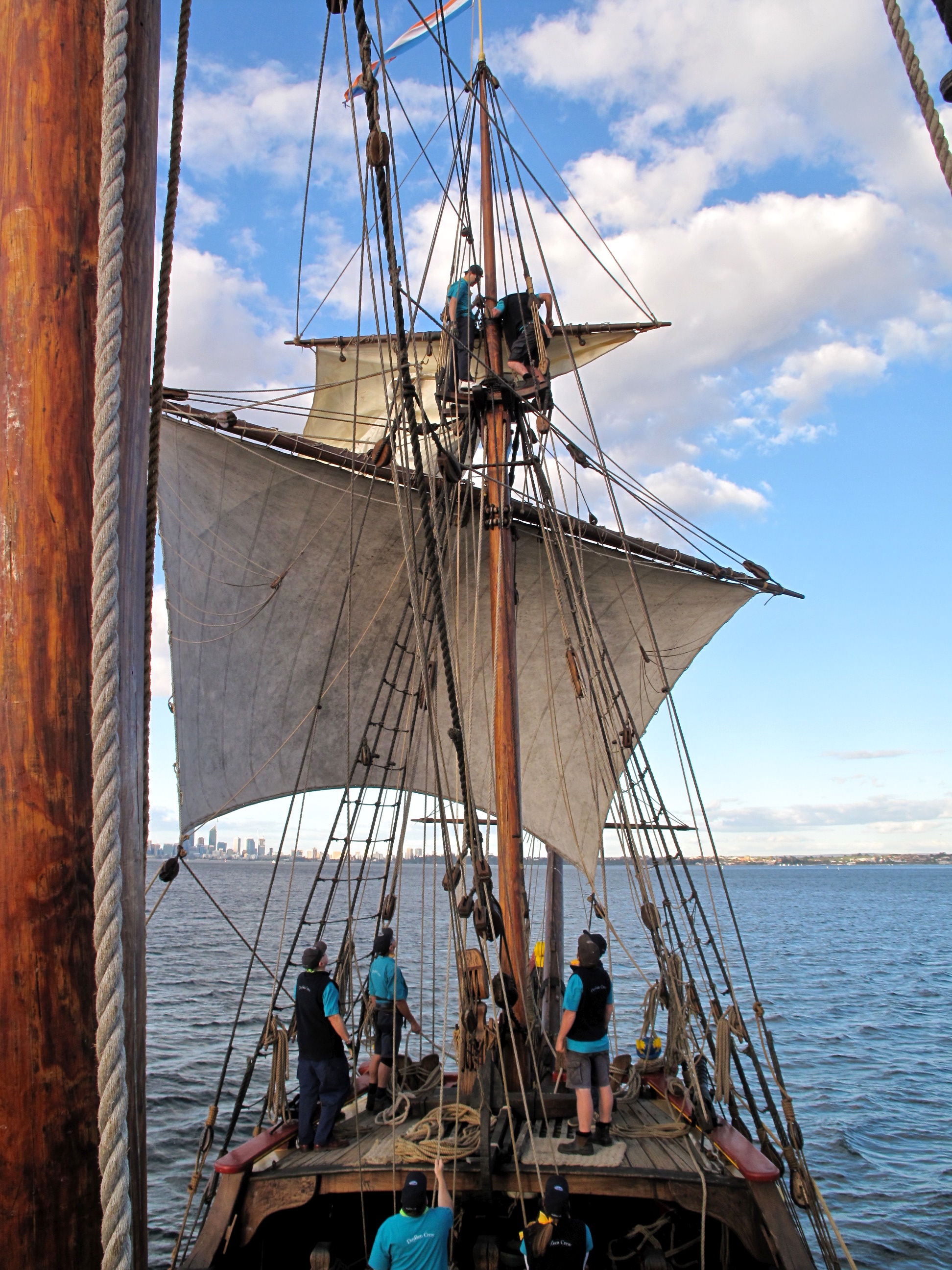So off we go on a perfect replica of a 17th century sailing boat. It is wonderful! The crew let me help with setting sails and stuff and in a typically ” No worries” way allow me to run around the boat with no restriction. The wind is strong, so we motor down the river towards Fremantle and then turn so the wind is behind us.