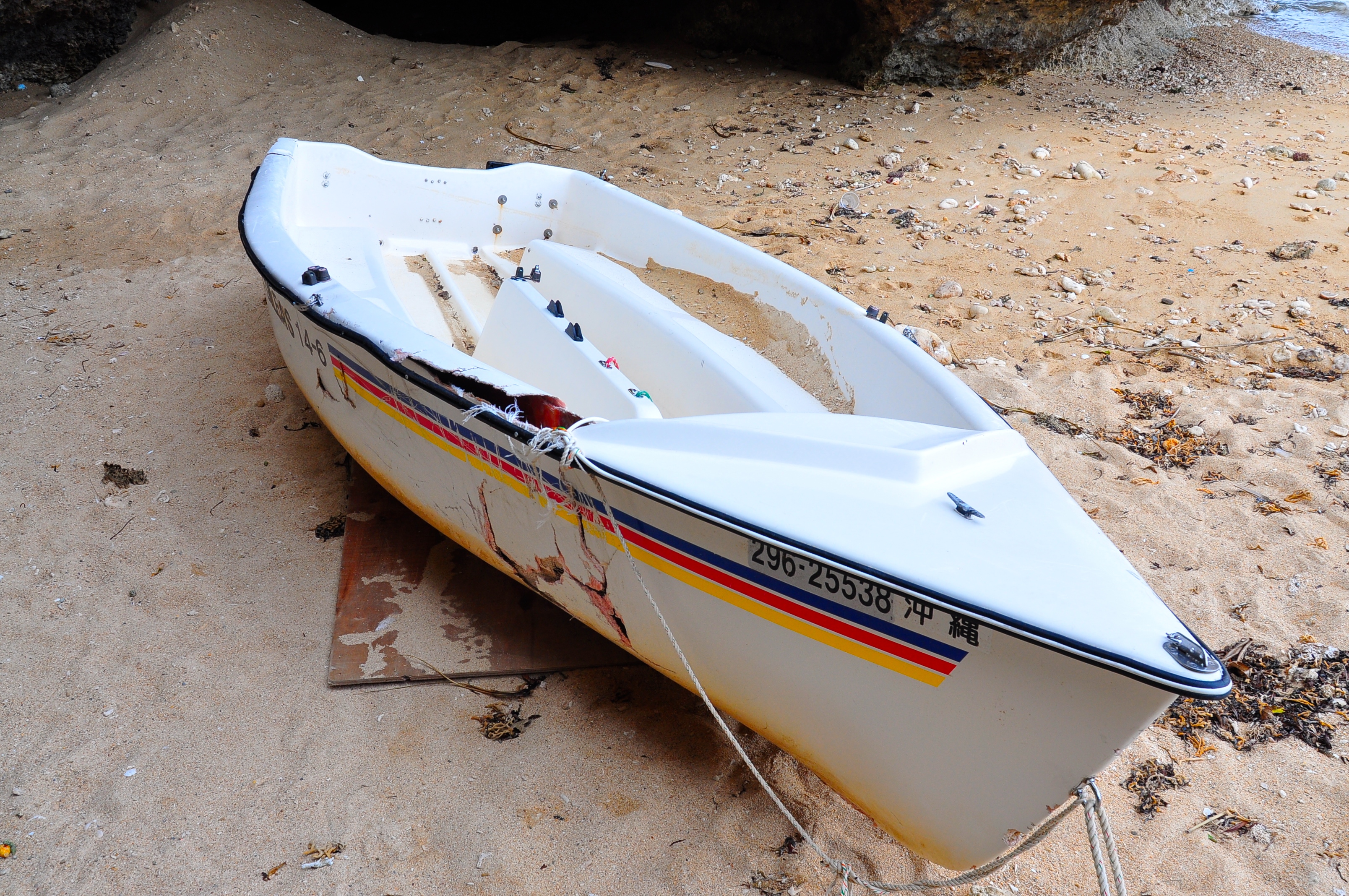 So back in Okinawa, I have to do something with poor wrecked Dileas. Having extracted her from the back passage with much difficulty she now lies stranded on the beach. Why she is still there is due to the fact that about a ton of sand was washed into the space between the inner and outer shells of the boat, making her impossible to move. I cannot leave her on the beach because I feel it is environmentally irresponsible and probably illegal.