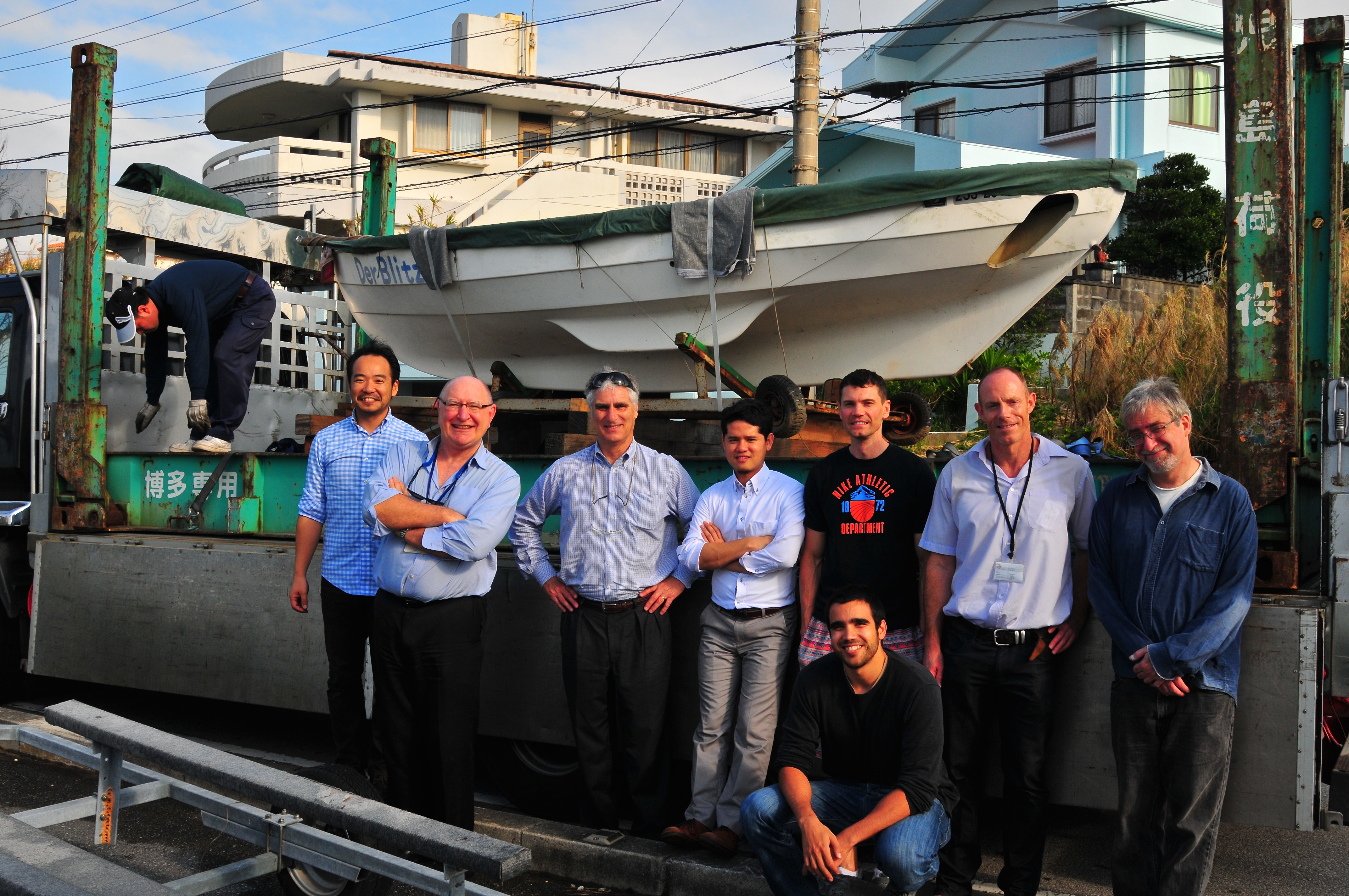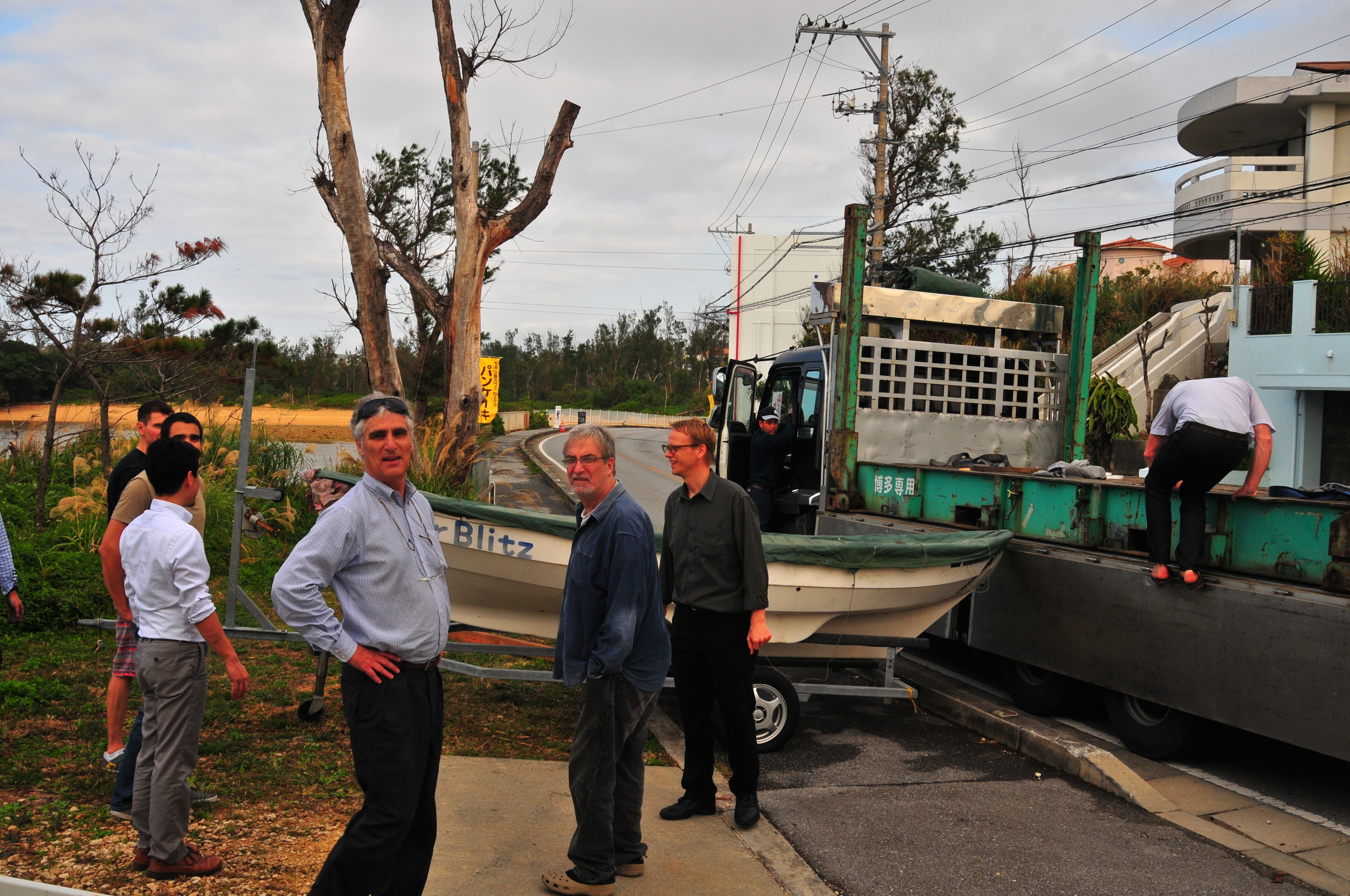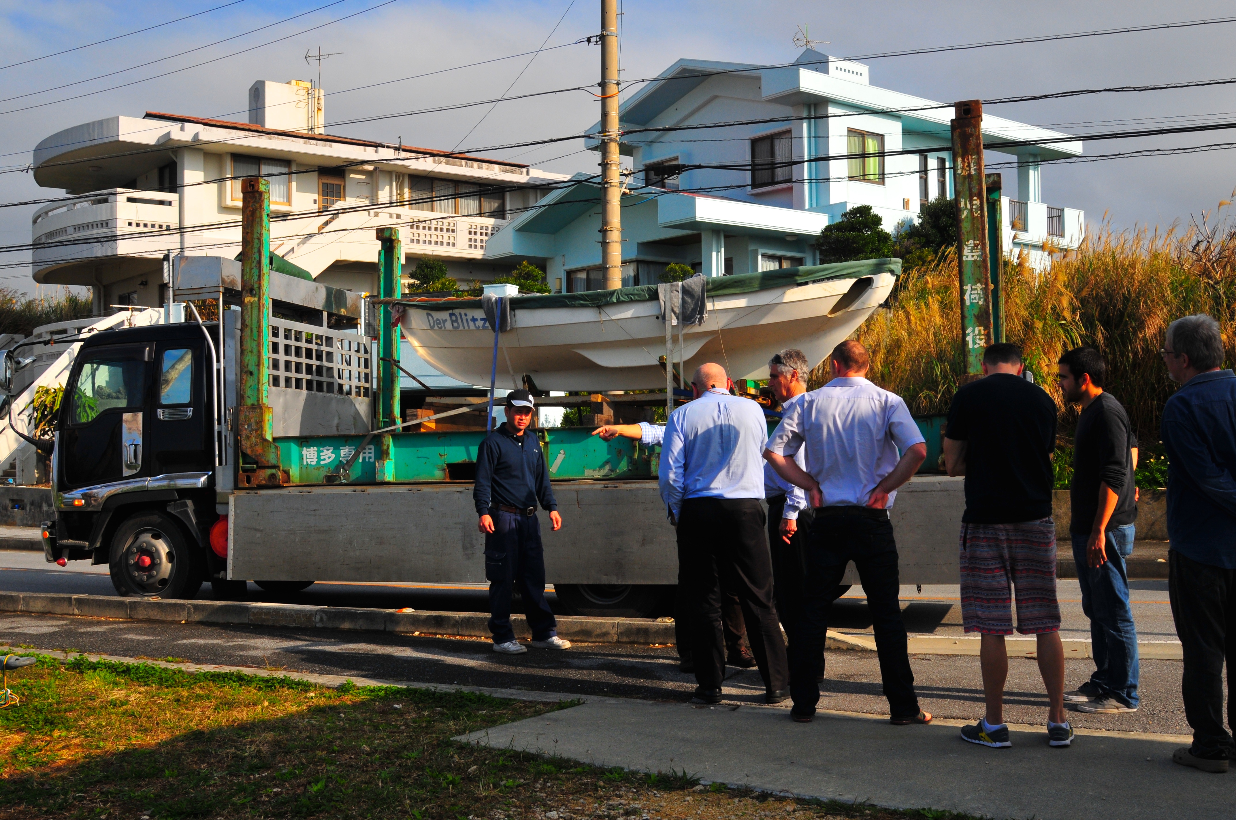 Of course there is no crane or anything to get the boat off the truck. I rally a lot of middle-aged muscle from the university and we manhandle her down onto the trailer that previously bore Dileas.