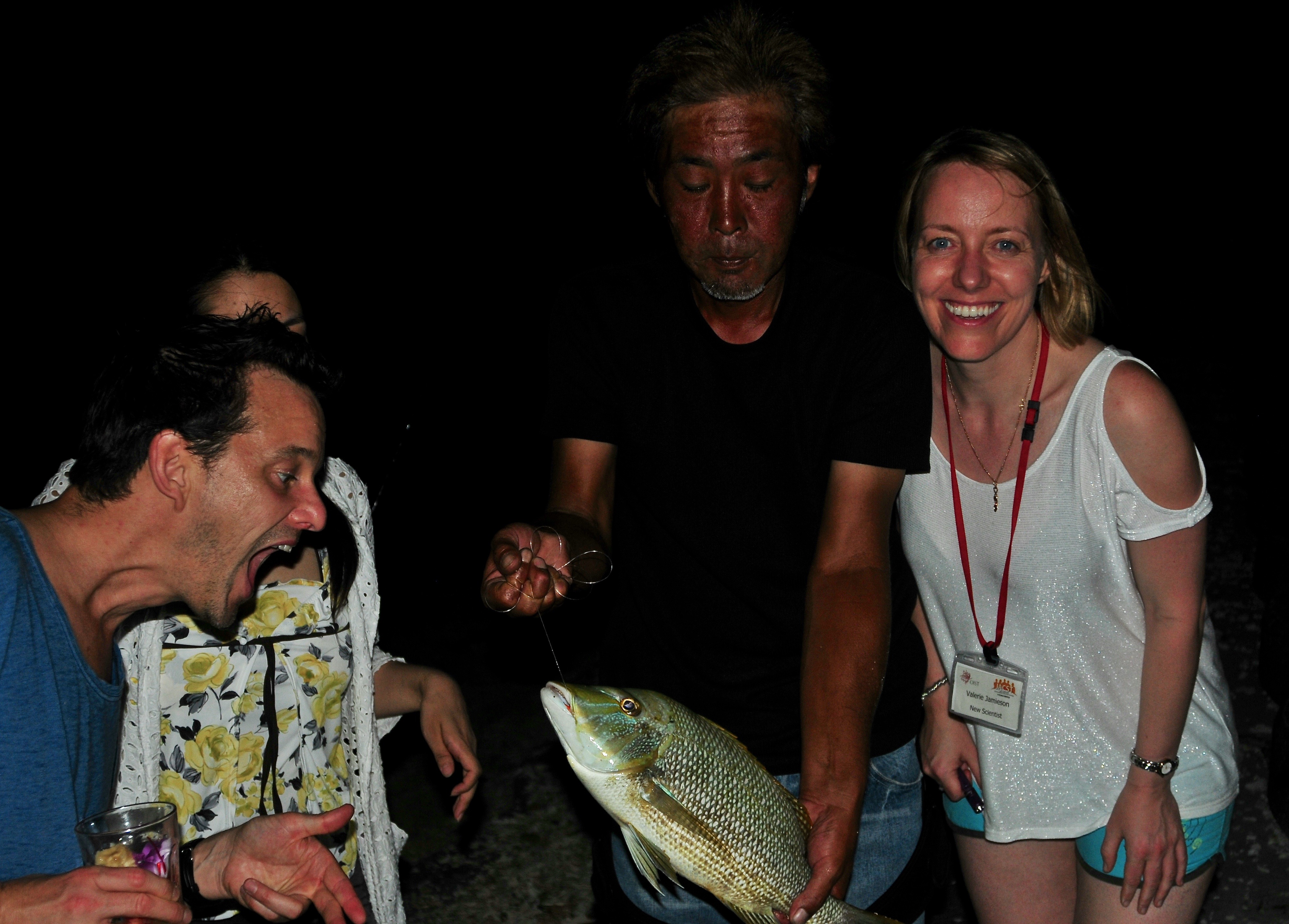 On the walk back to the house one of the fisher folk reels in a massive fish.